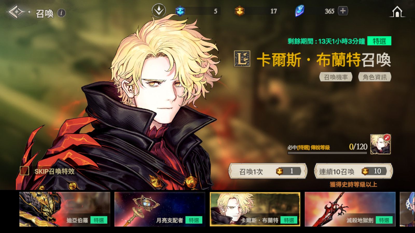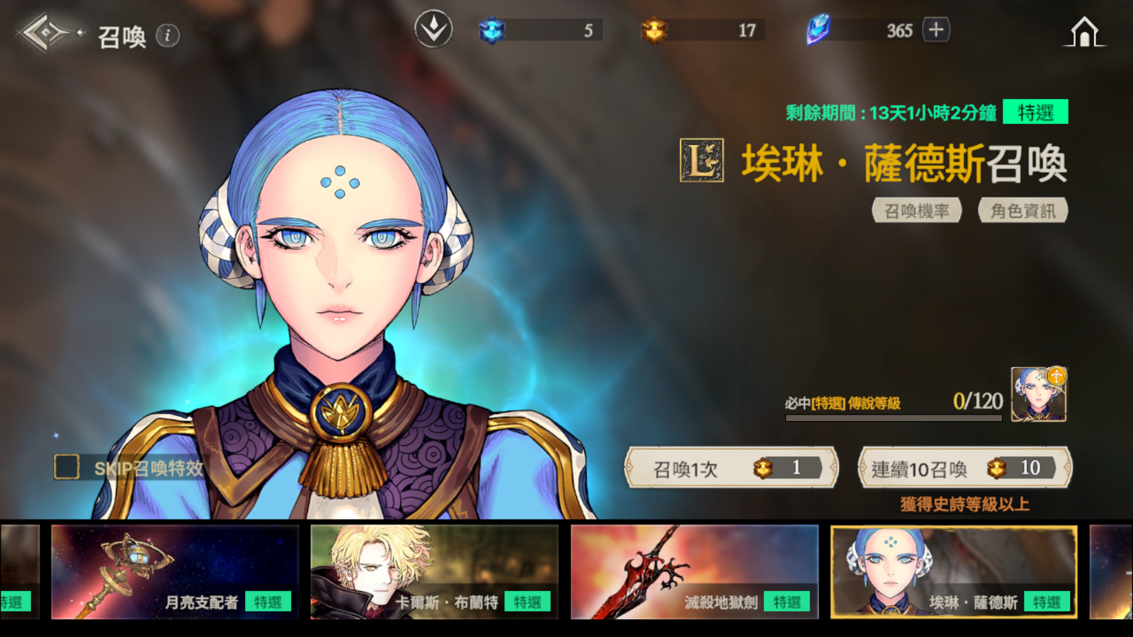 ※ 如果到累計召喚120次為止還沒有獲得特選角色,那麼在第120次時將必中特選角色。