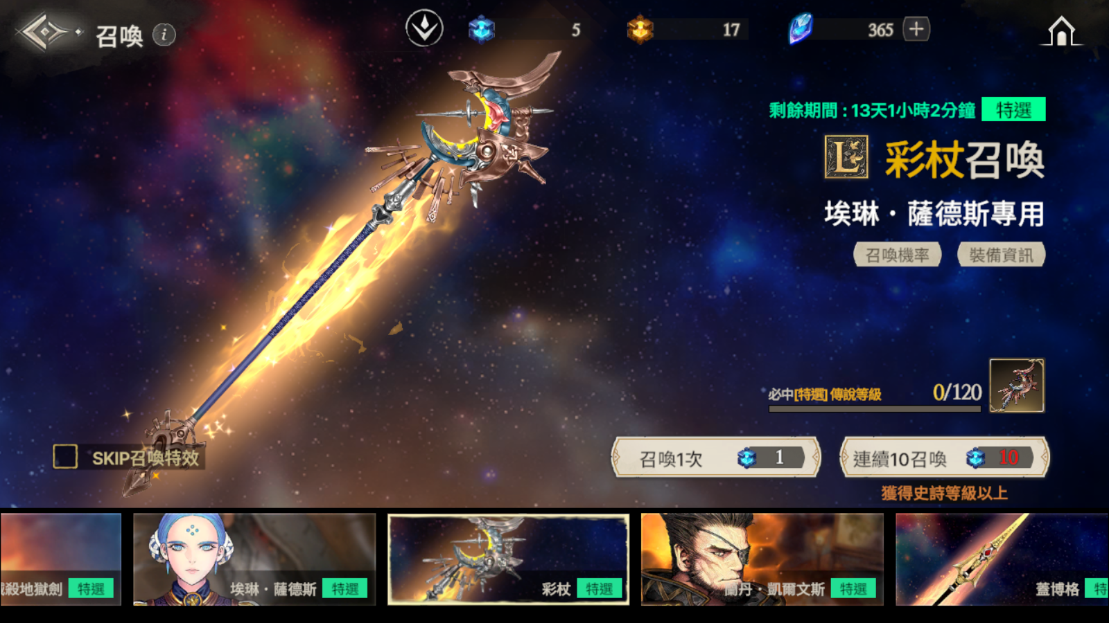 ※ 如果到累計召喚120次為止還沒有獲得特選武器,那麼在第120次時將必中特選武器。