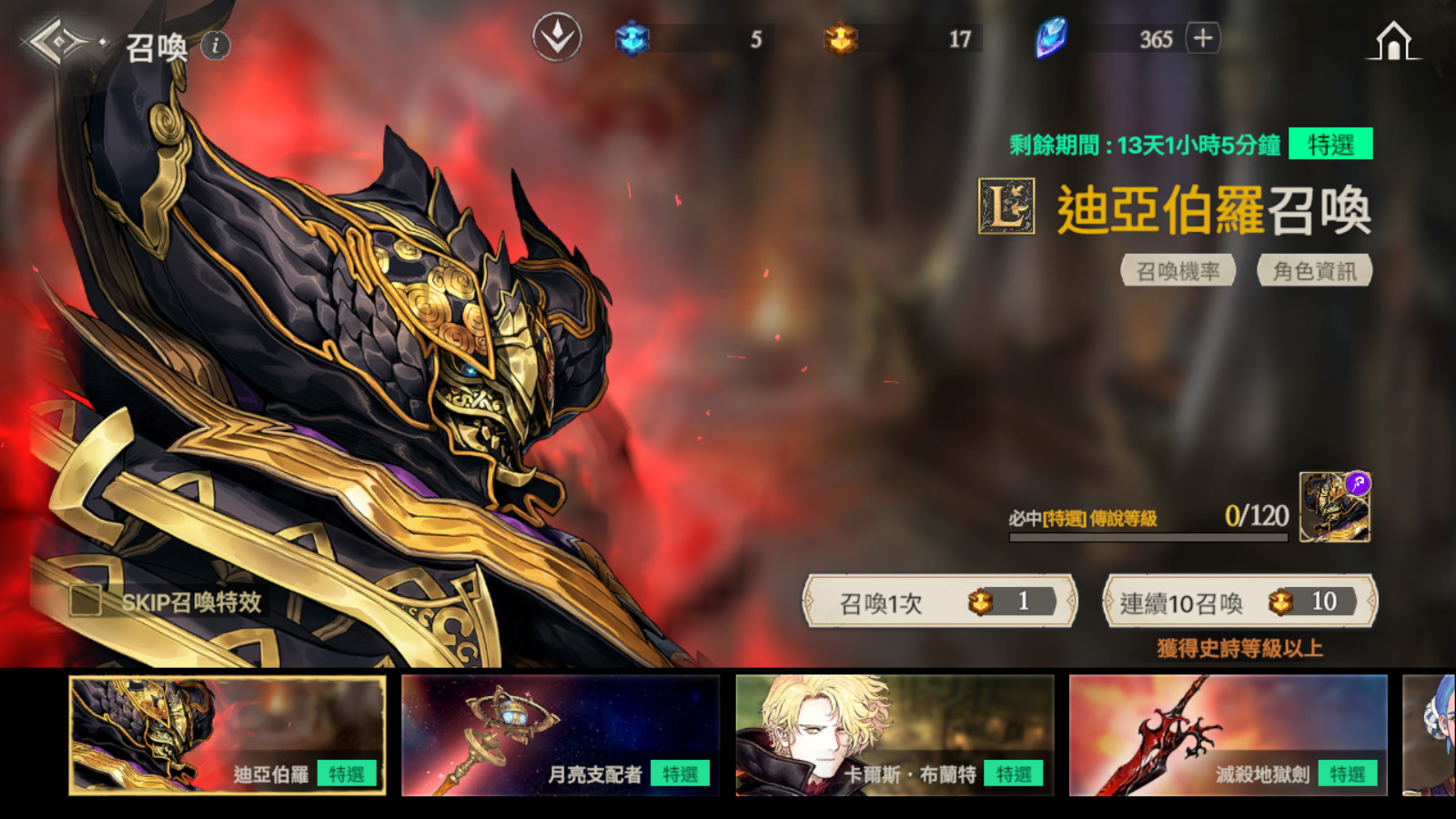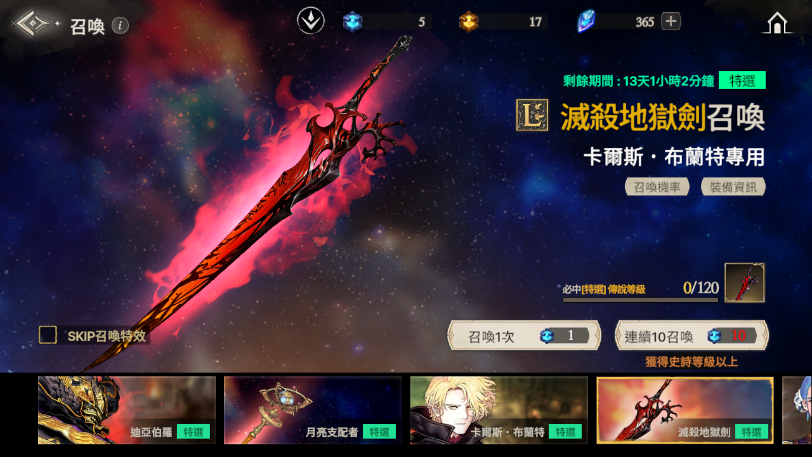※ 召喚時,如果獲得傳說等級的武器但並非特選武器時,必中次數不會重置。
