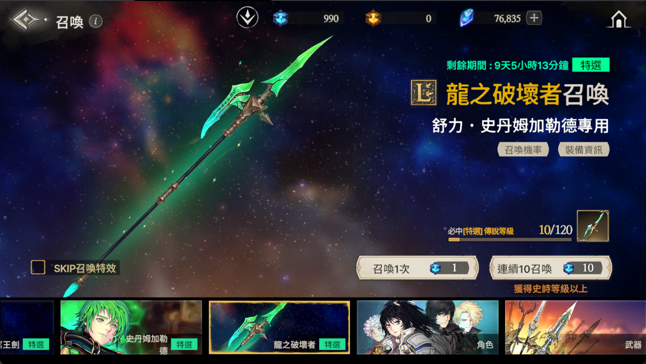 ※ 如果到累計召喚120次為止還沒有獲得特選武器,那麼在第120次時將必中特選武器。