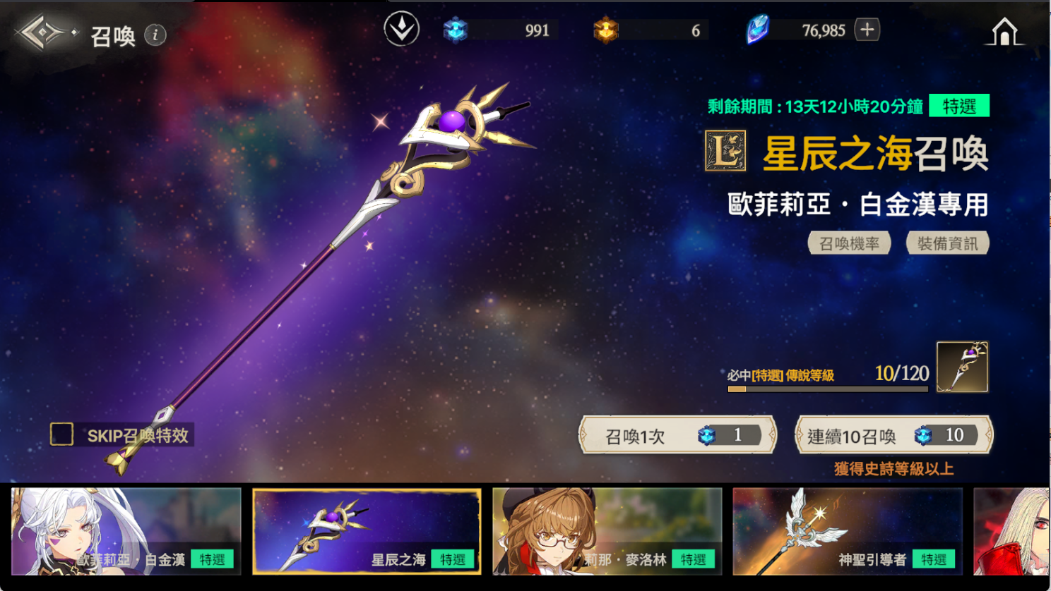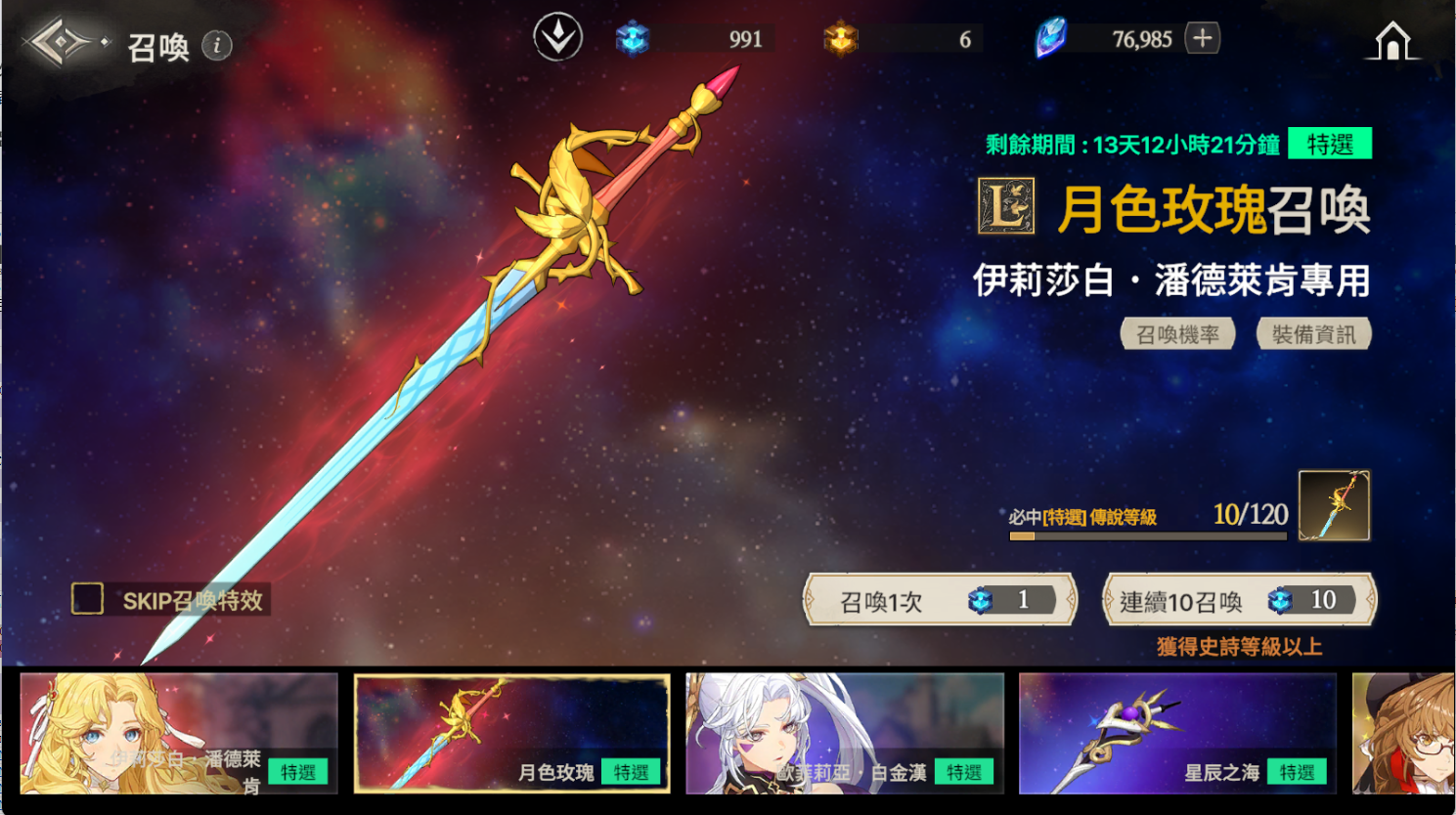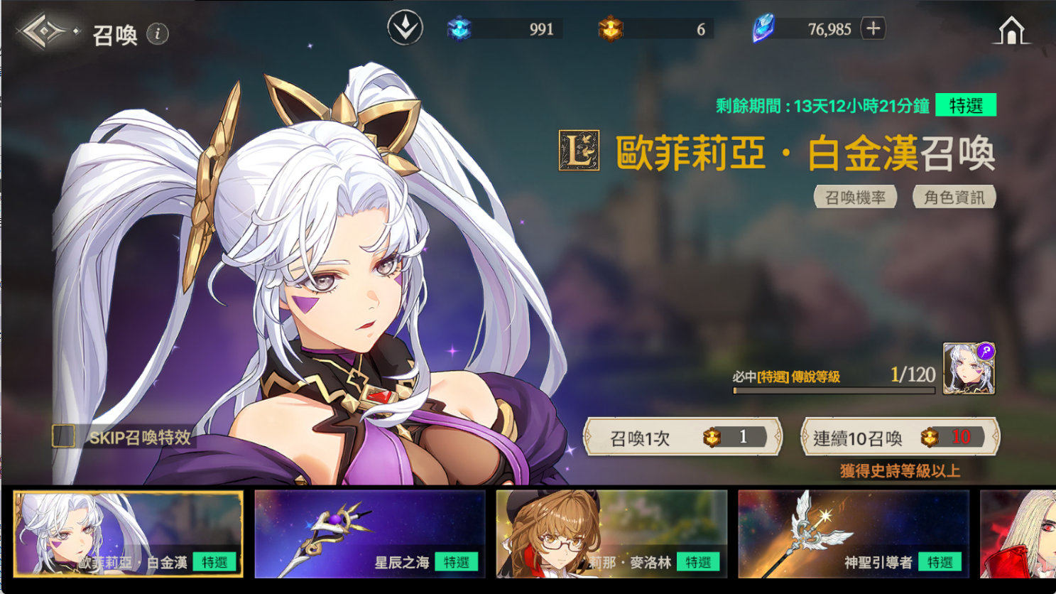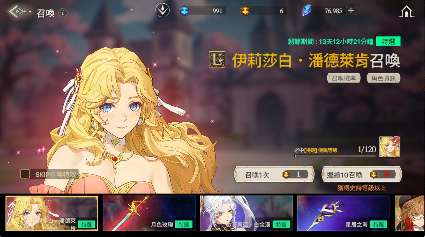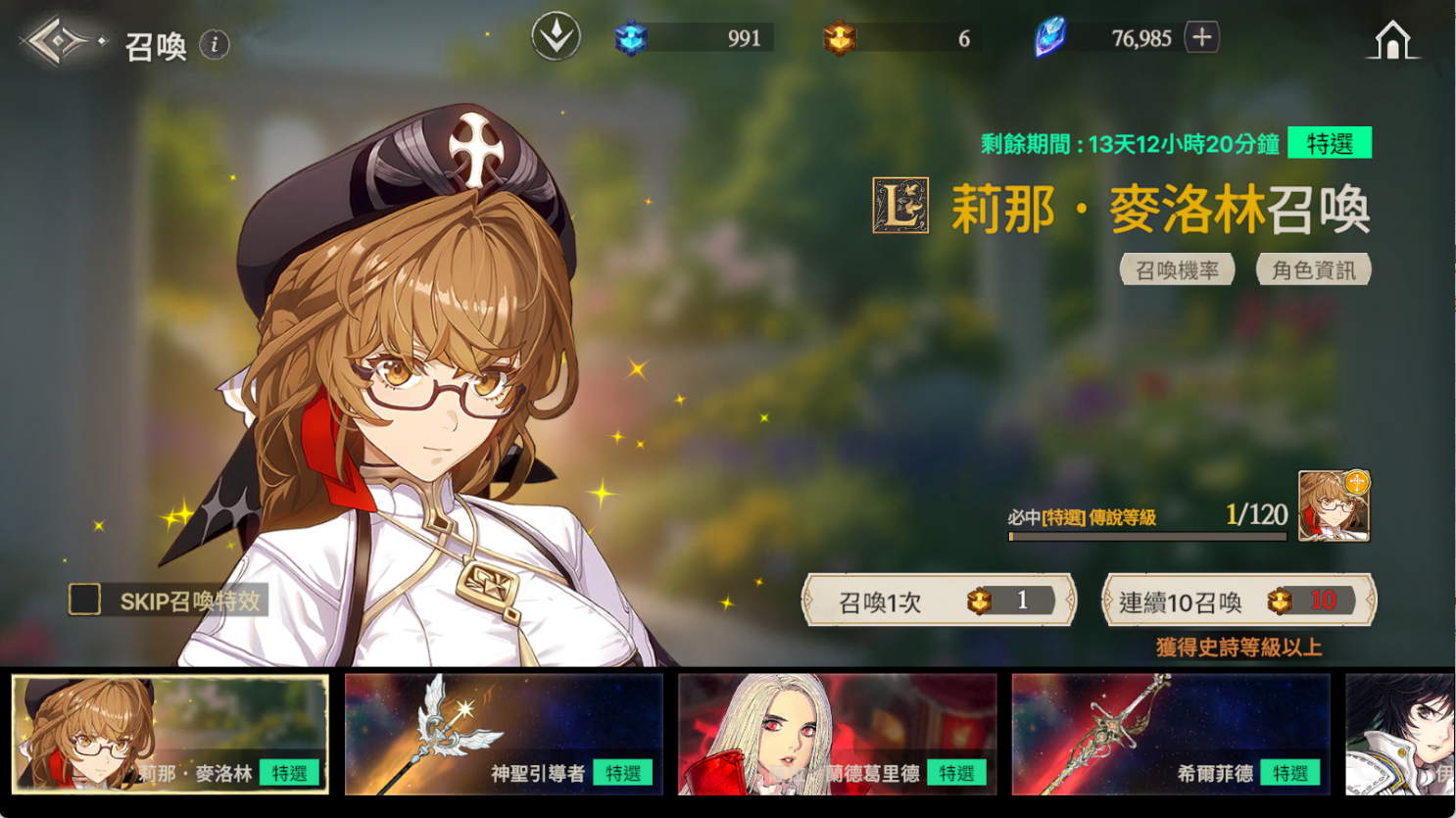 ※ 如果到累計召喚120次為止還沒有獲得特選角色,那麼在第120次時將必中特選角色。