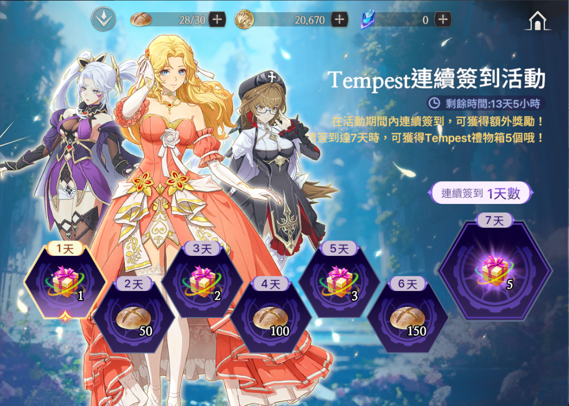 活動說明:每日簽到可以領取特別的Tempest禮物以及勇士麵包哦!