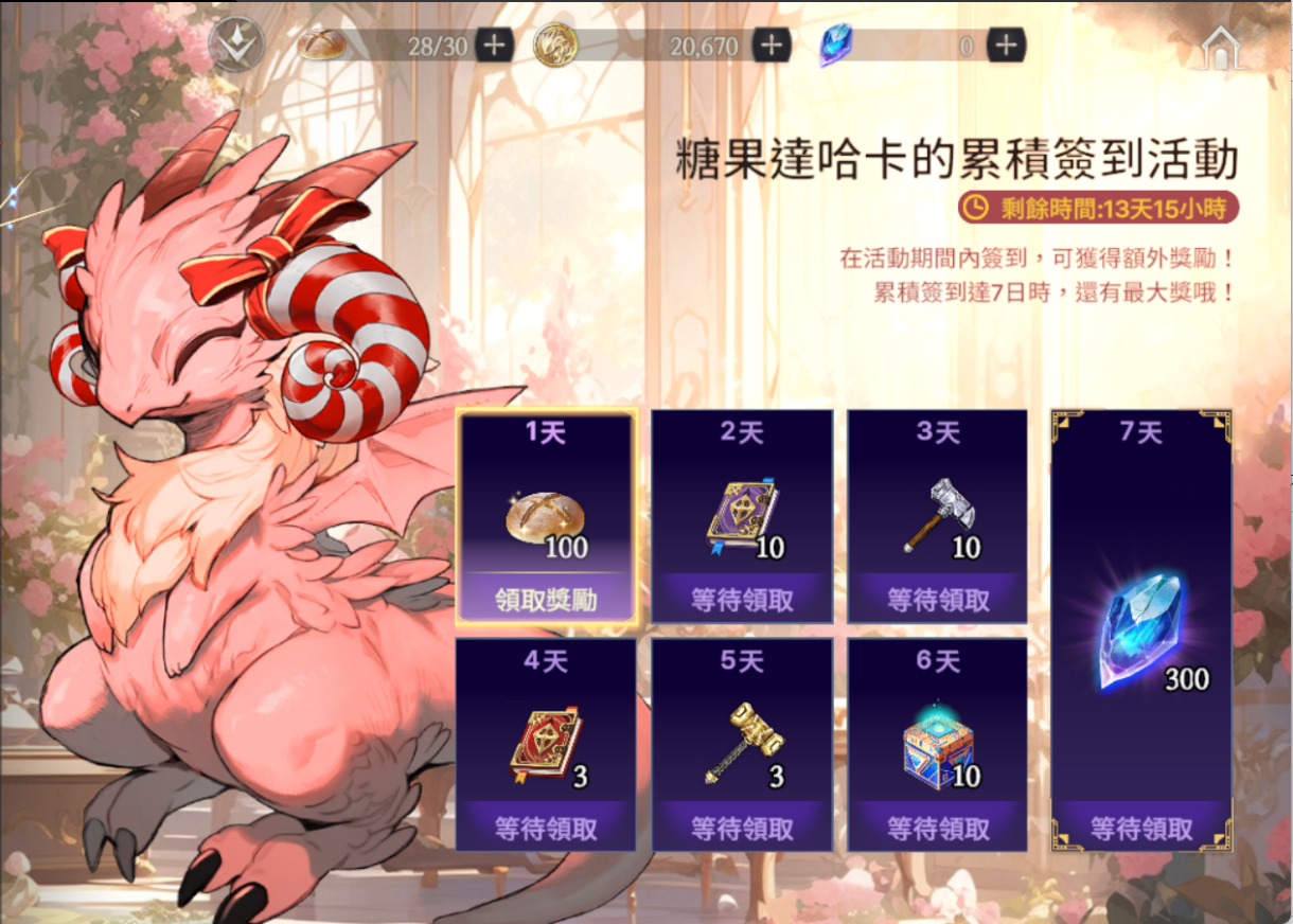 - 糖果達哈卡的累計簽到活動,可以透過每日登入領取到額外獎勵哦