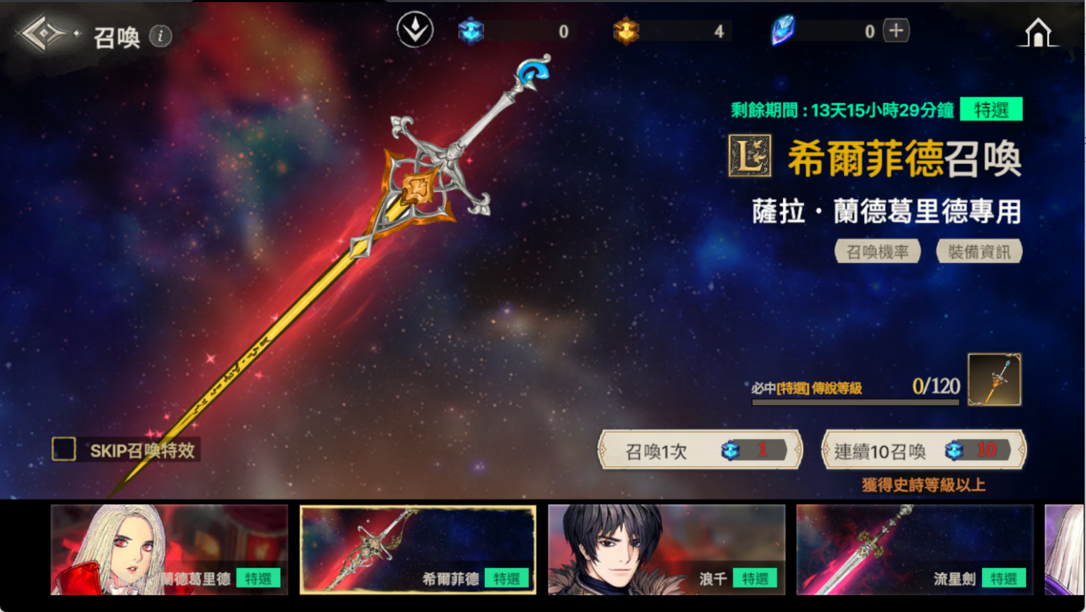 ※ 召喚時,如果獲得傳說等級的武器但並非特選武器時,必中次數不會重置。