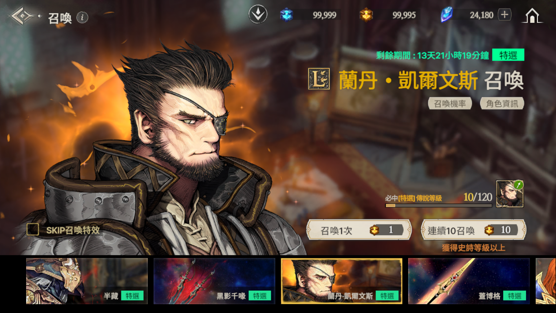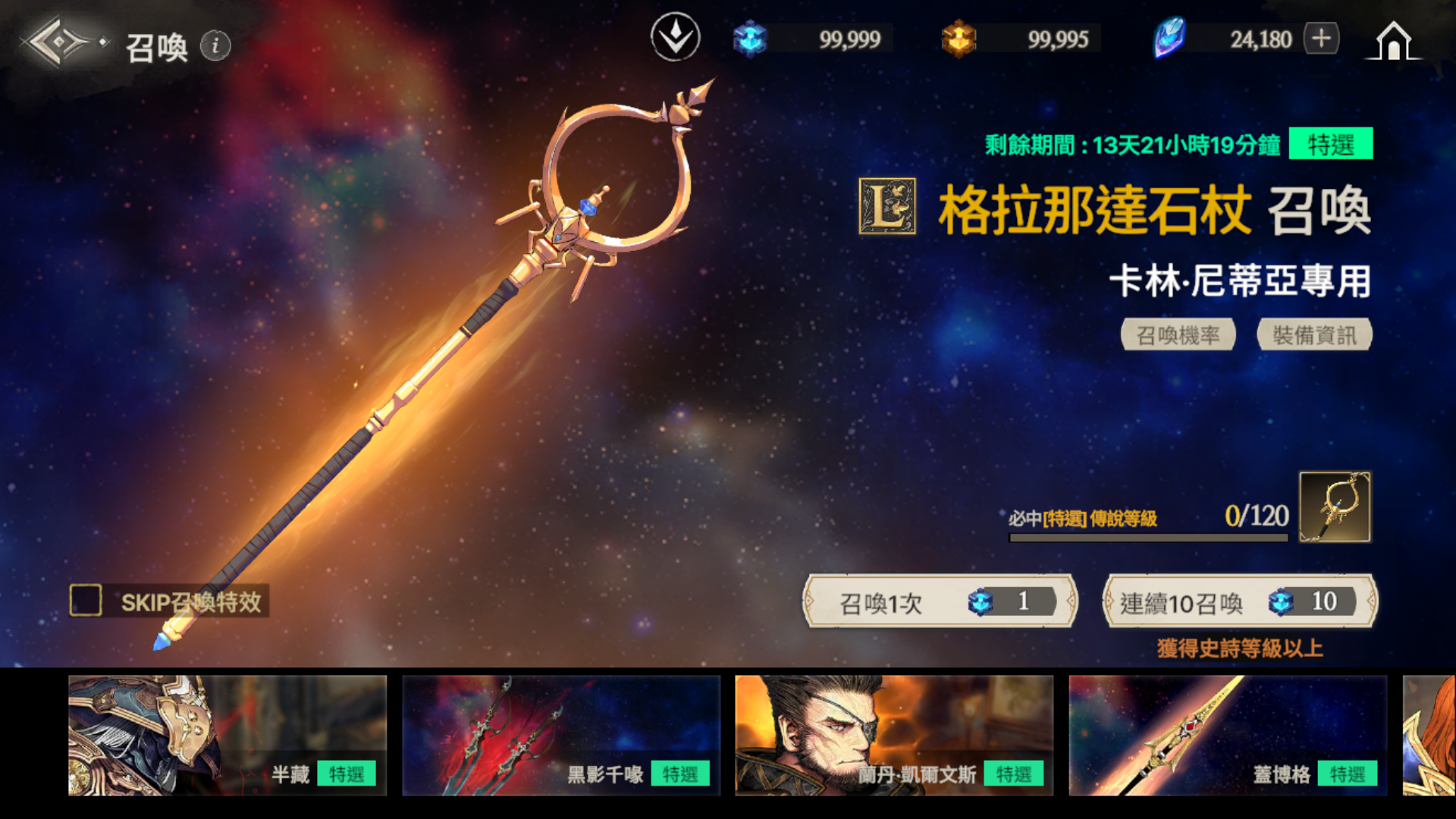 ※ 如果到累計召喚120次為止還沒有獲得特選角色,那麼在第120次時將必中特選角色。