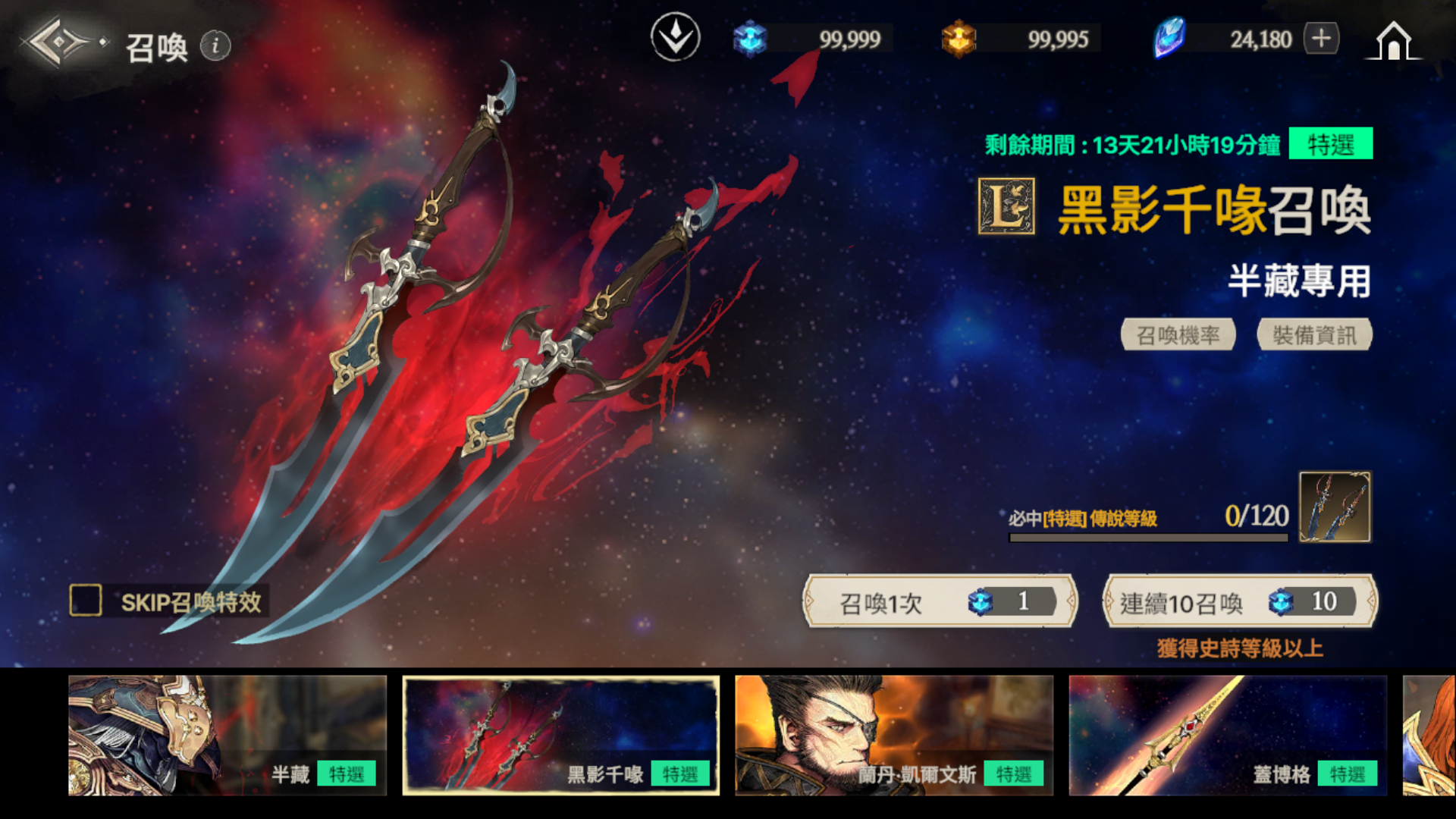 ※ 如果到累計召喚120次為止還沒有獲得特選武器,那麼在第120次時將必中特選武器。