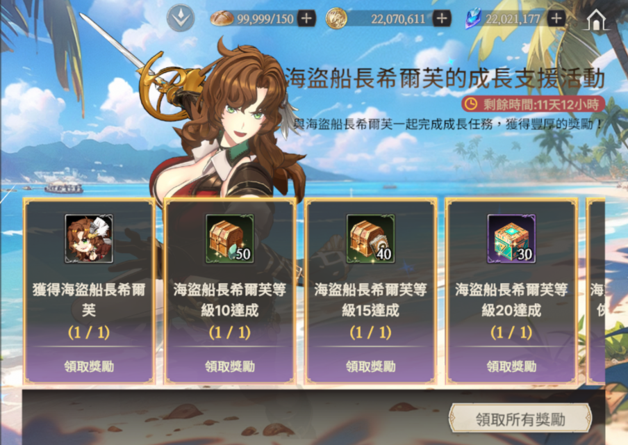 立即獲得: 海盜王的寶劍*1 任一角色覺醒1次: 萬物方塊*30 完成轉職1次 :透明蛋白石*1 任一角色達到等級10:寶石碎片箱*200 任一角色達到等級15:秘傳箱 I*200 任一角色達到等級20:寶石塊箱*200 任一角色達到等級30:秘傳箱 II*200 任一角色達到等級40:無瑕寶石箱*200 任一角色達到等級50:秘傳箱 III*200 |