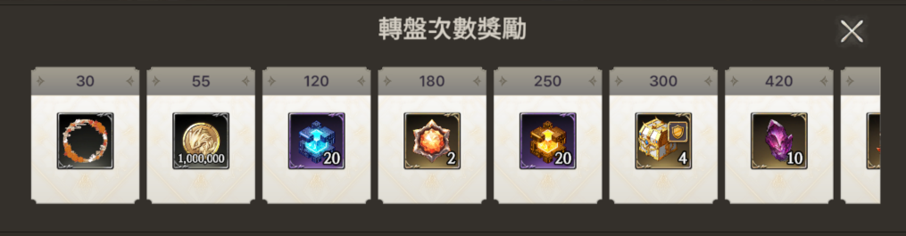 ※ 每進行一次轉盤可獲得1個轉盤點數,獲取達一定數量可額外獲得獎勵。