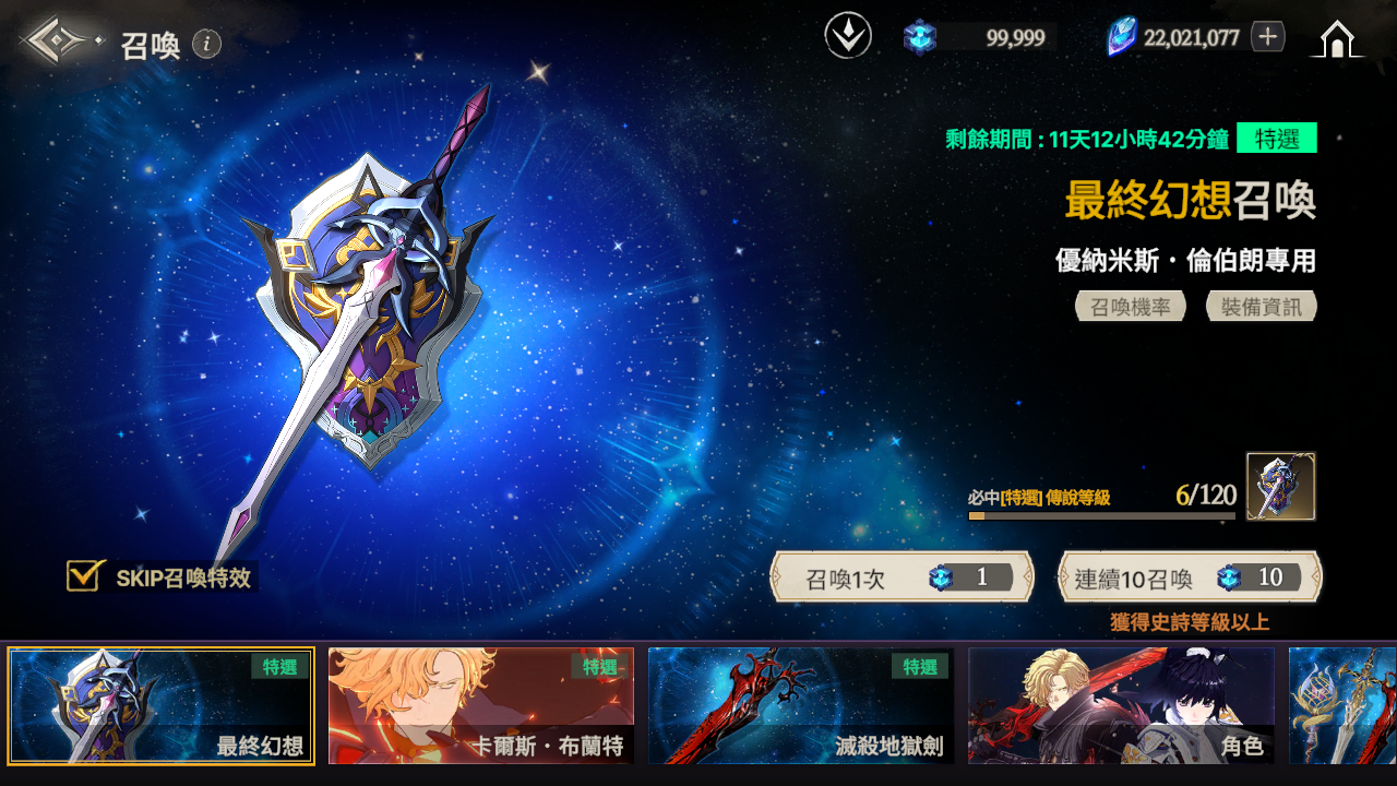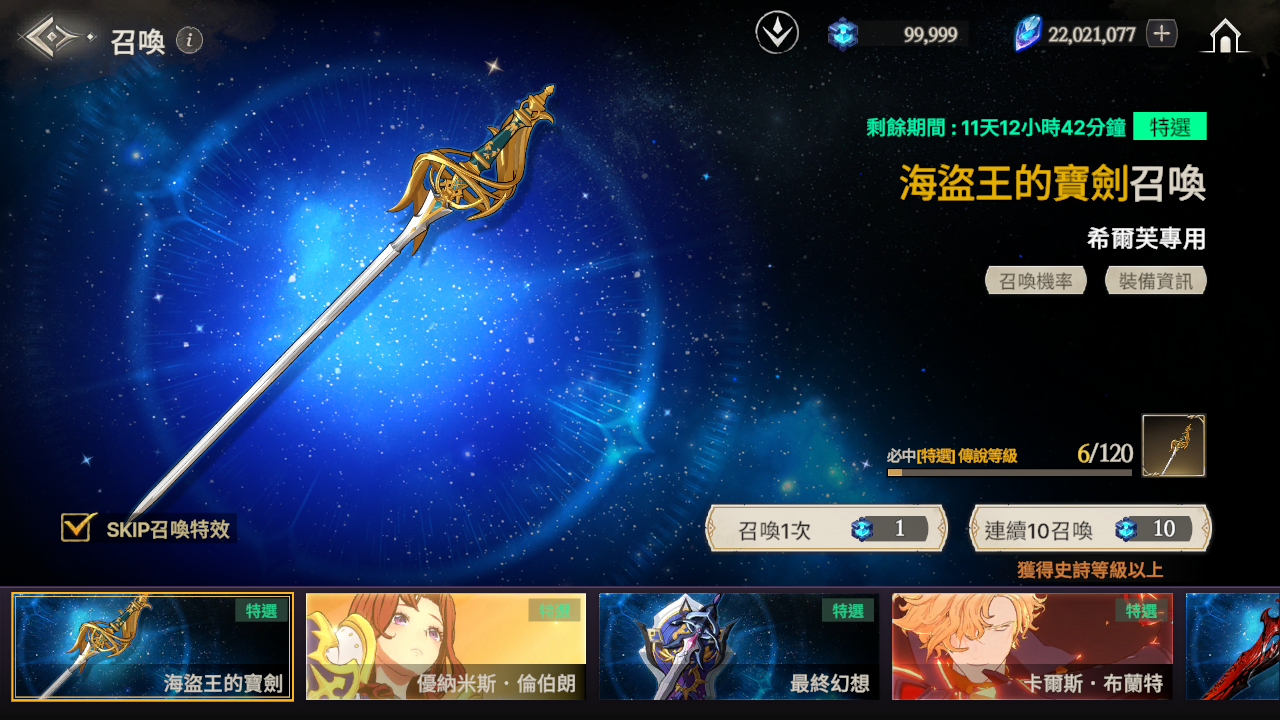 ※ 召喚時,如果獲得傳說等級的武器但並非特選武器時,必中次數不會重置。