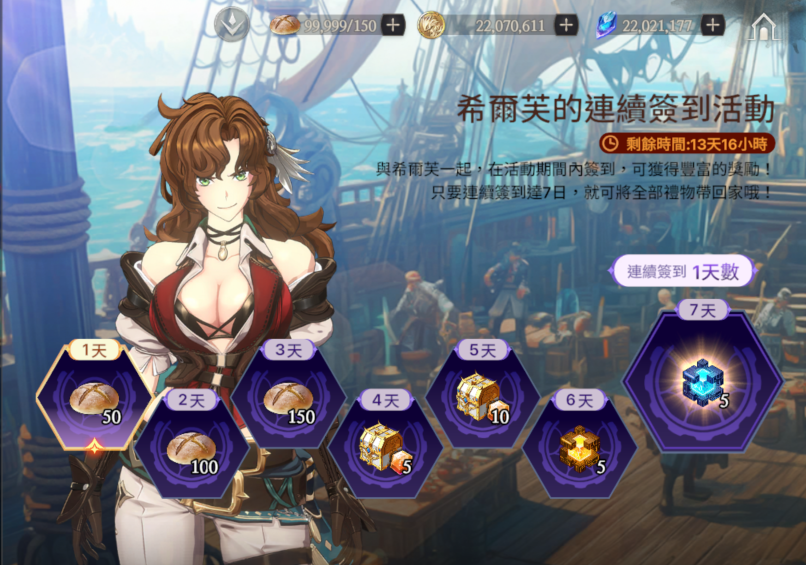 活動說明:與希爾芙一起,在活動期間內簽到,可獲得豐富的獎勵!