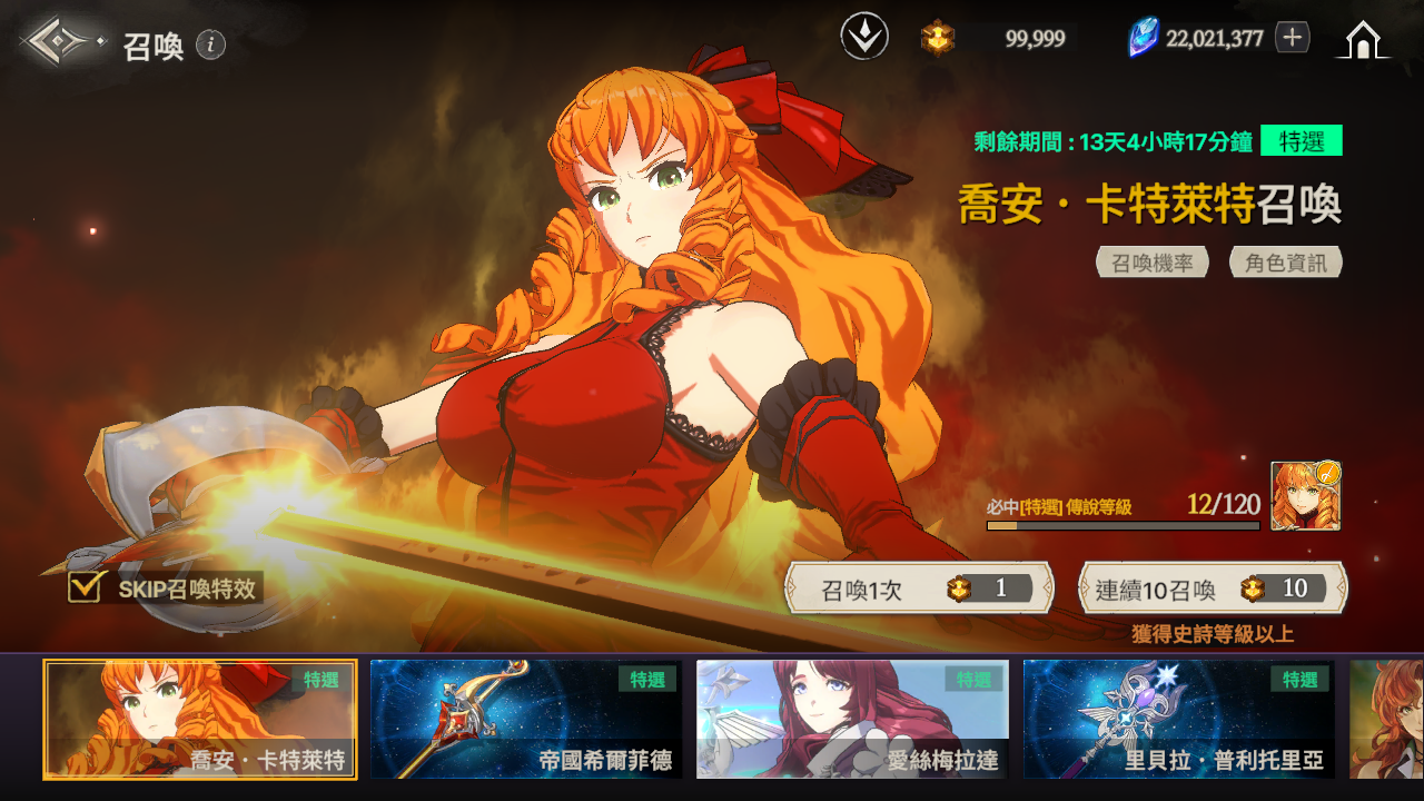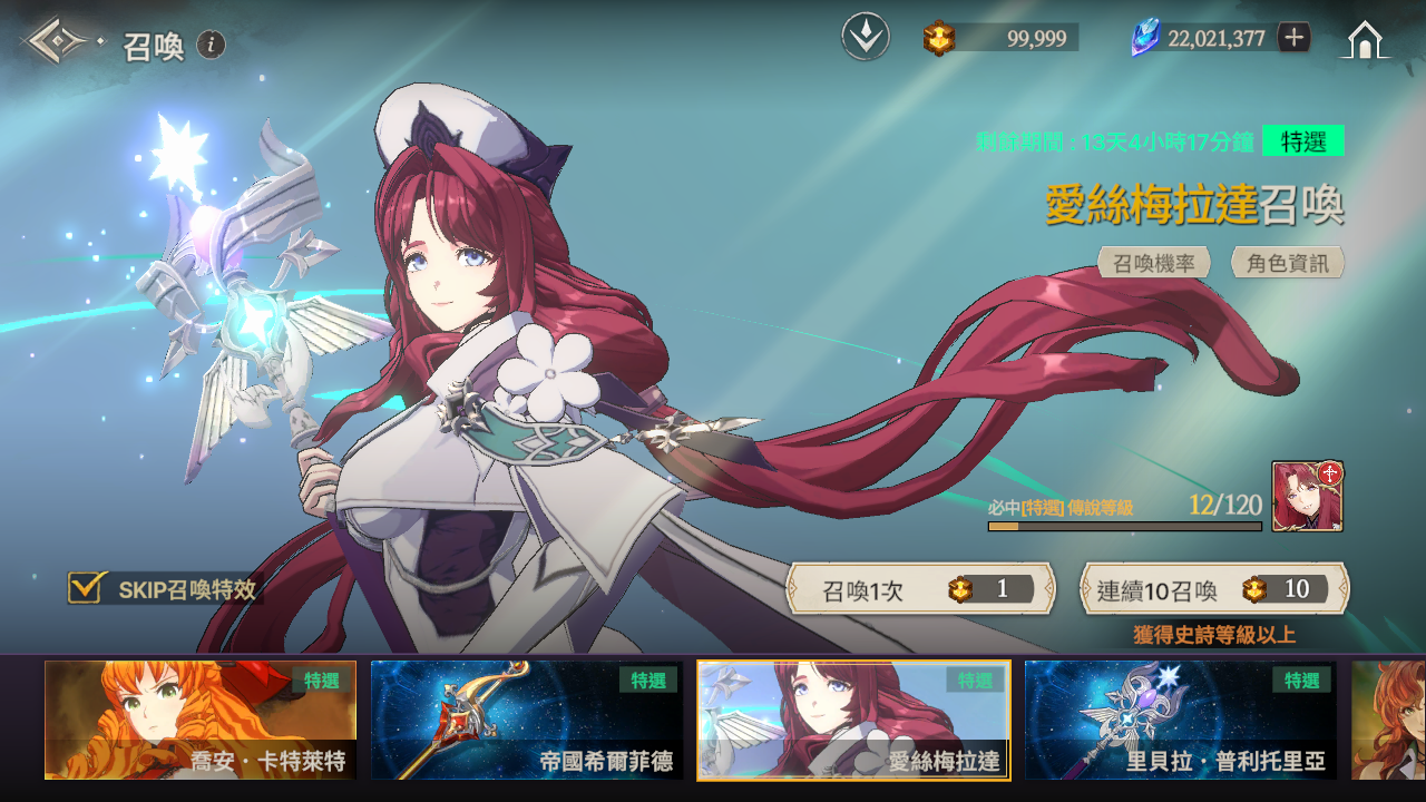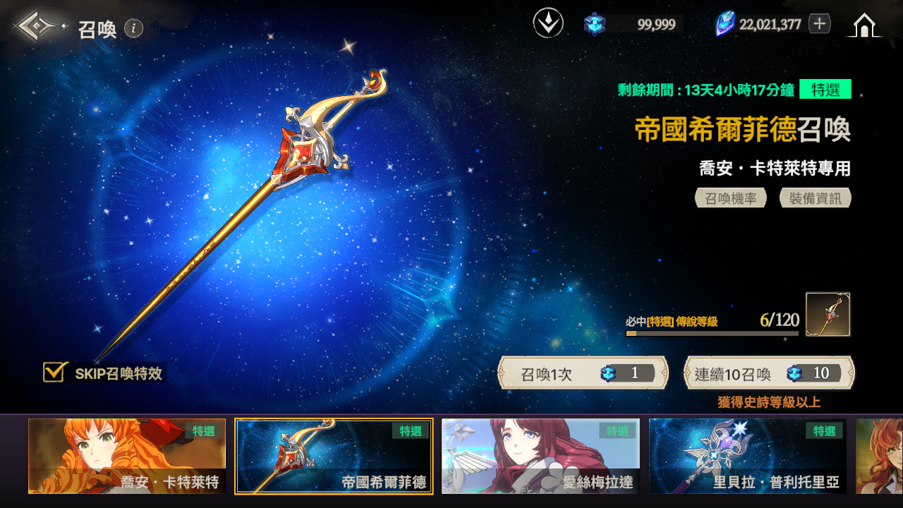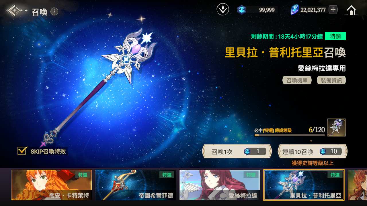 ※ 如果到累計召喚120次為止還沒有獲得特選角色,那麼在第120次時將必中特選角色。
