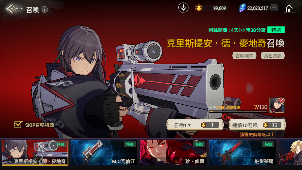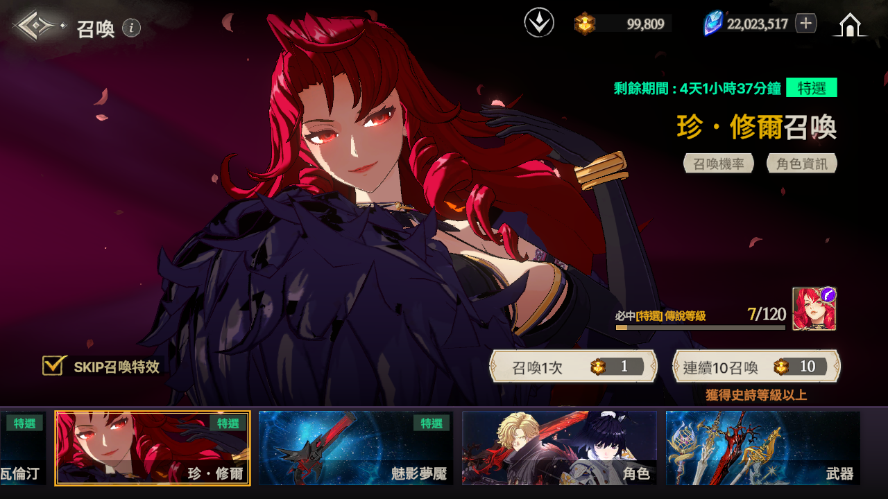 ※ 召喚時,如果獲得傳說等級的角色但並非特選角色時,必中次數不會重置。