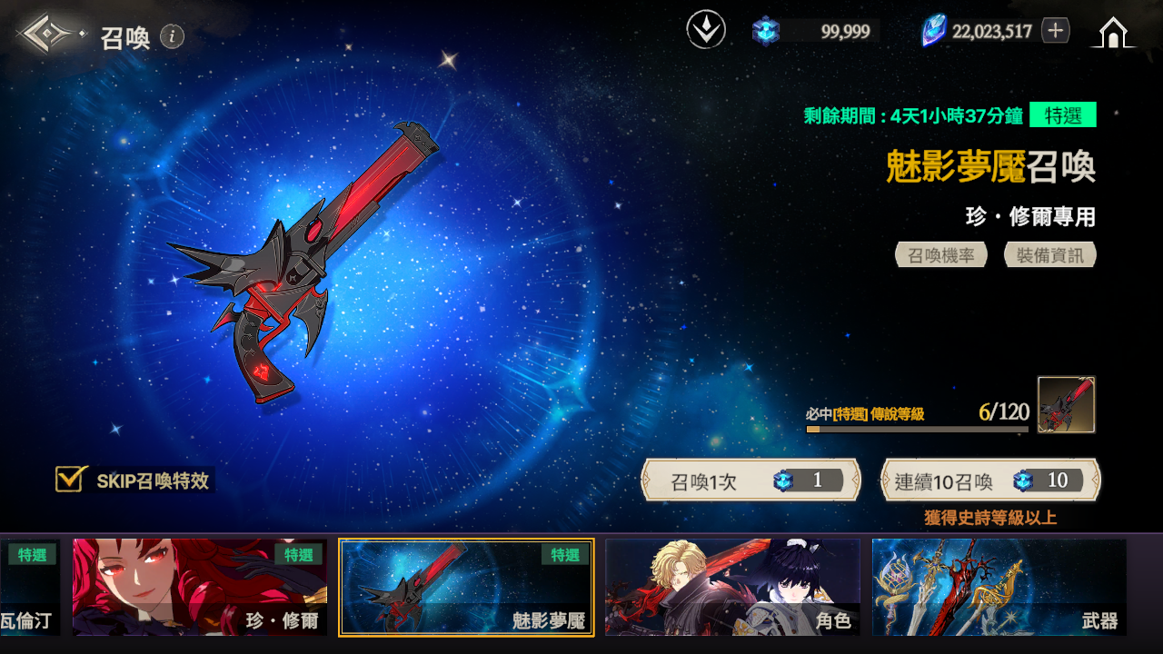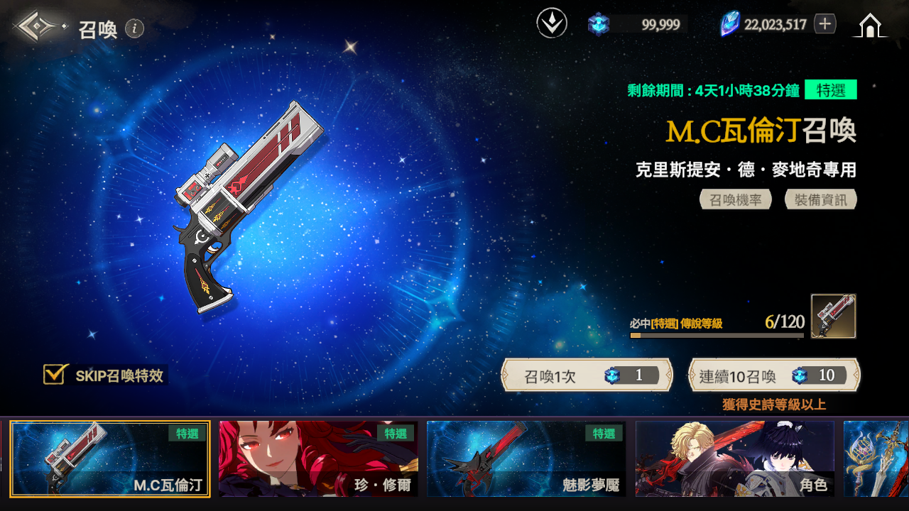 ※ 召喚時,如果獲得傳說等級的武器但並非特選武器時,必中次數不會重置。
