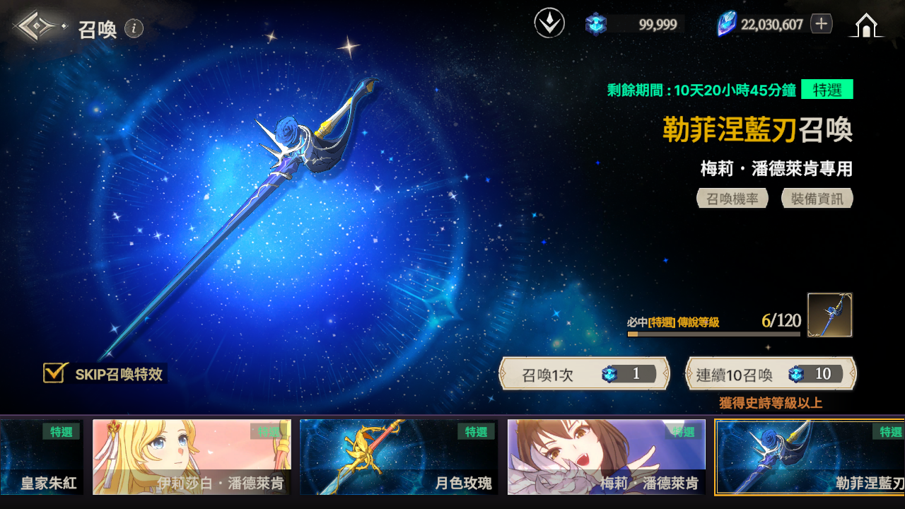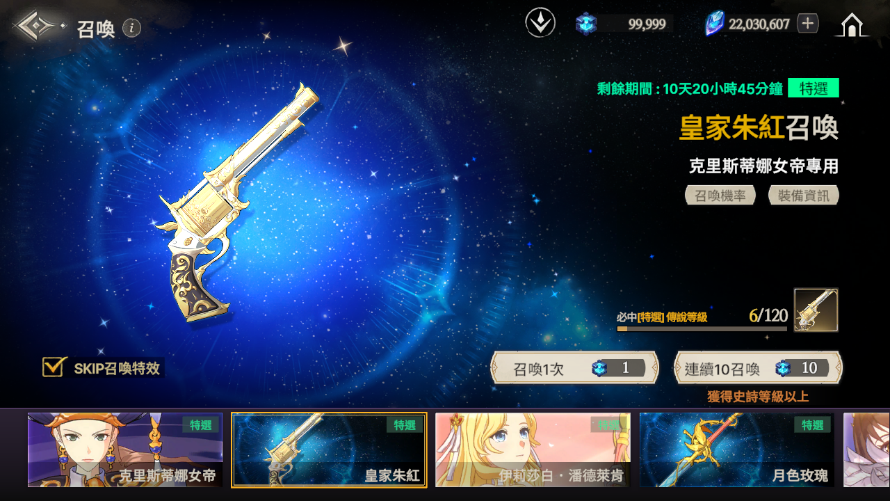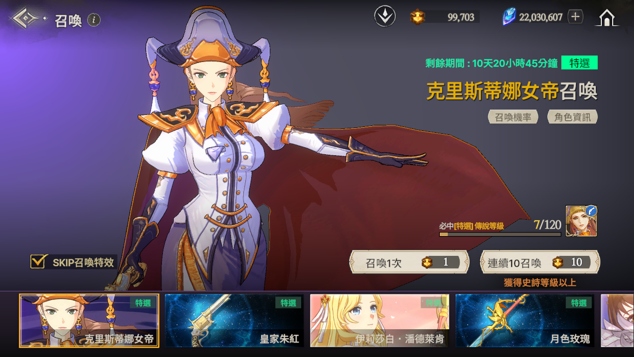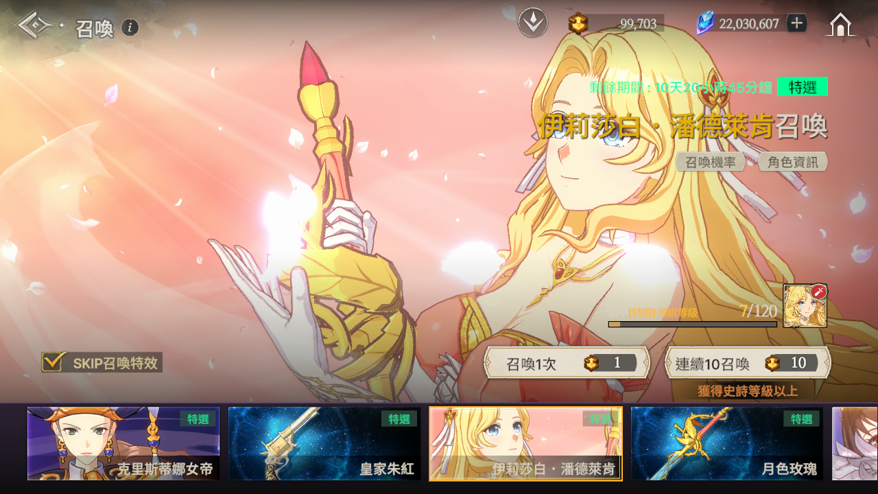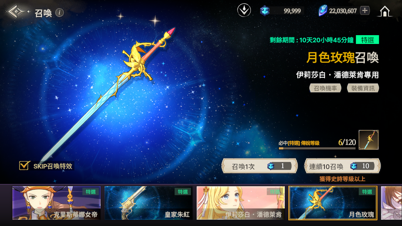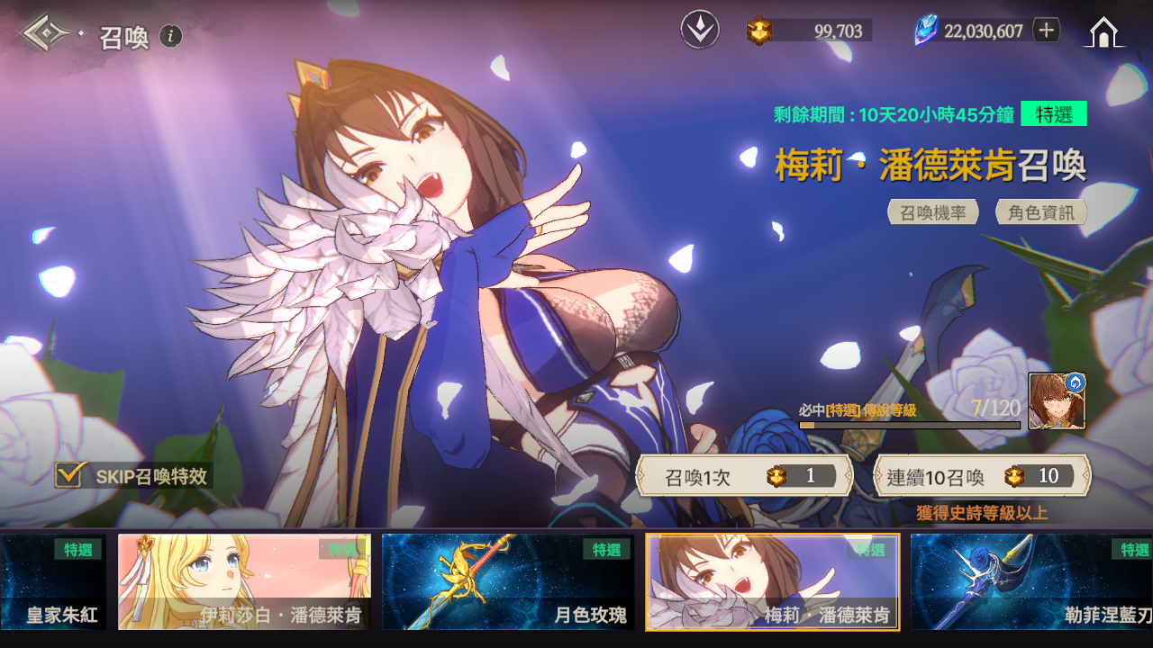 ※ 如果到累計召喚120次為止還沒有獲得特選角色,那麼在第120次時將必中特選角色。