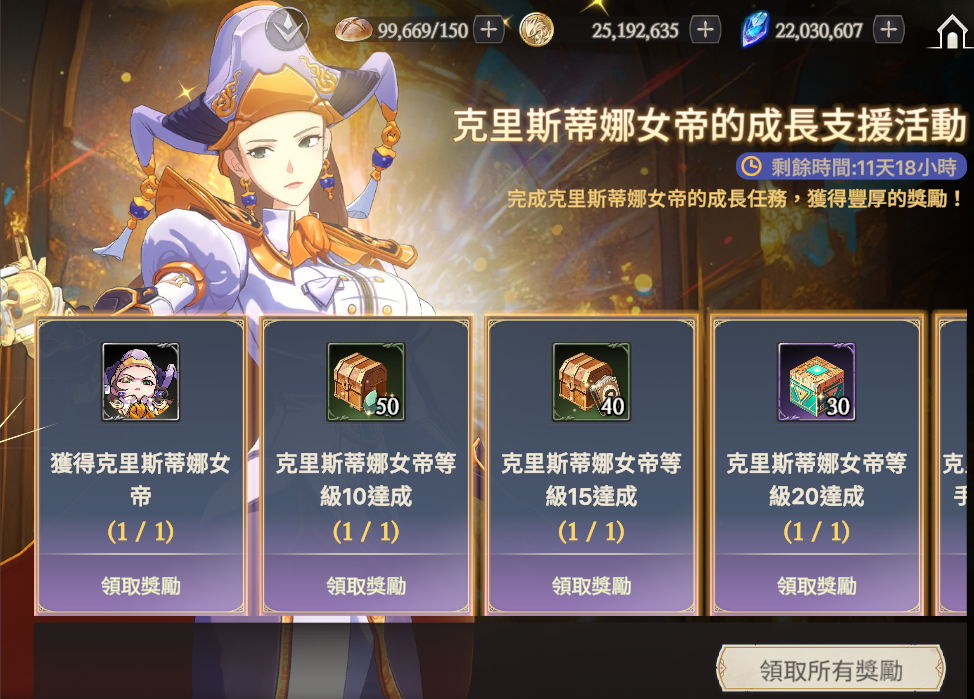 活動說明:與克里斯蒂娜女帝一起完成成長任務,獲得豐富的獎勵吧!
