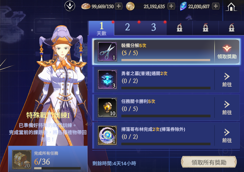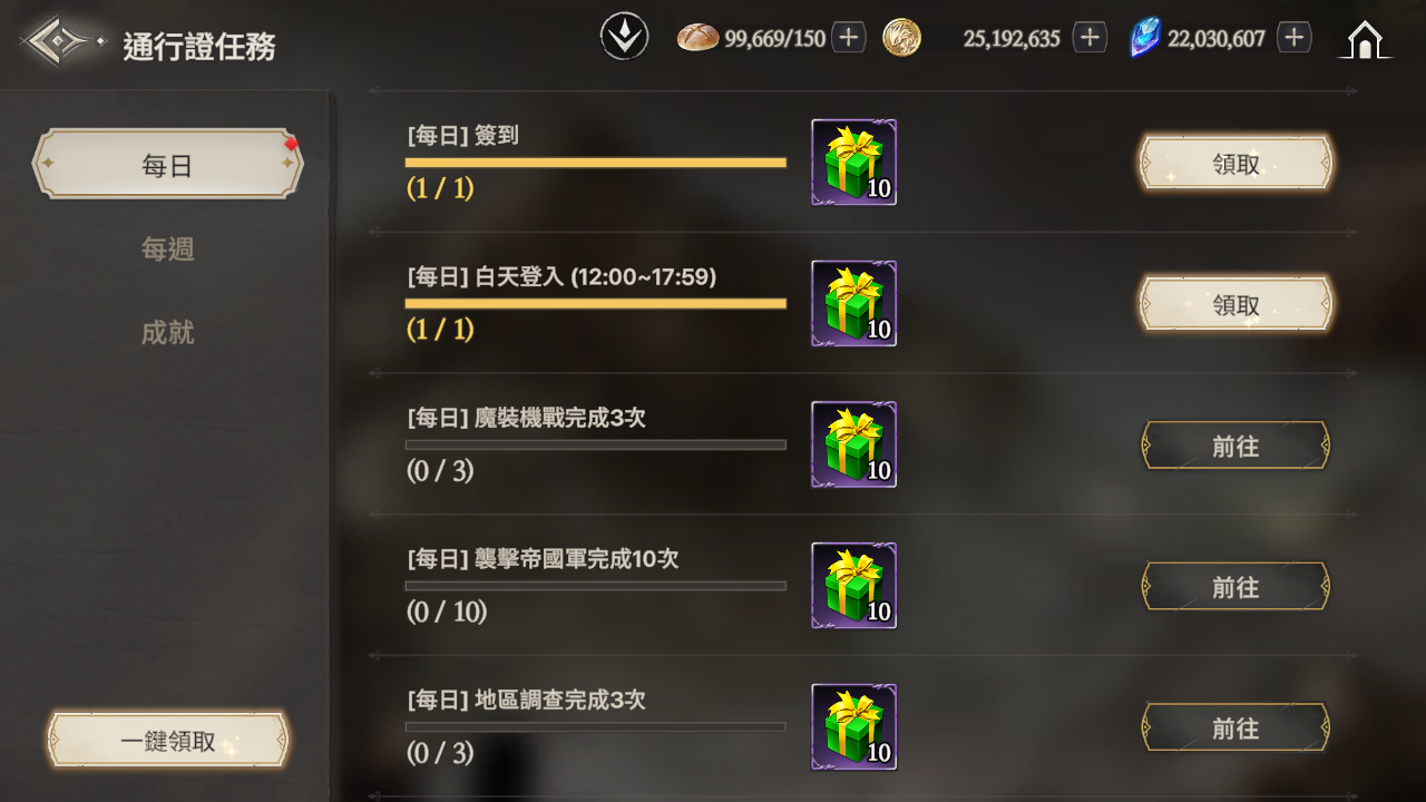 - 通行證任務分為每日、每周和成就任務