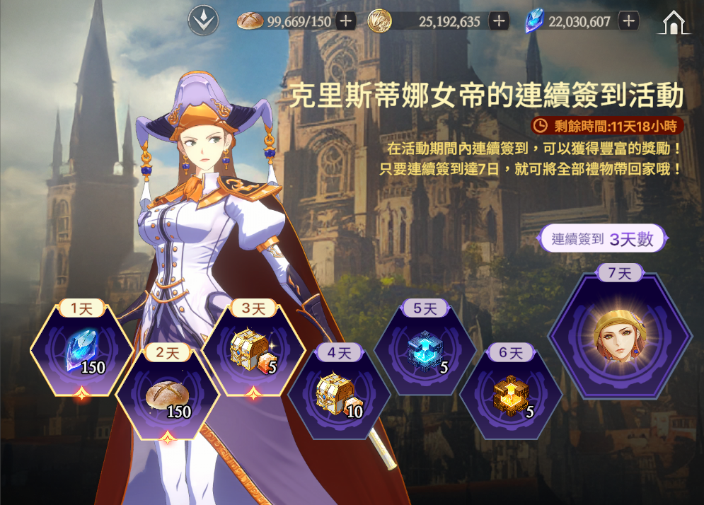 只要連續簽到達7日,可以直接獲得克里斯蒂娜女帝!