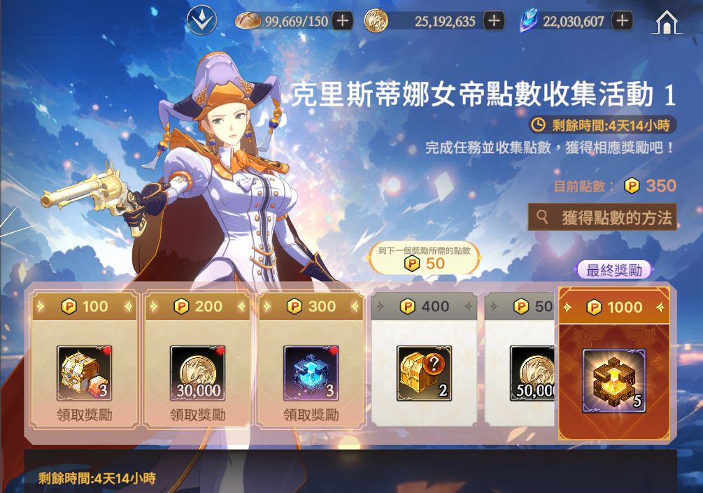 ※ 克里斯蒂娜女帝通行證: 購買當日開始計算,30日內可以達成該活動並領取獎勵。