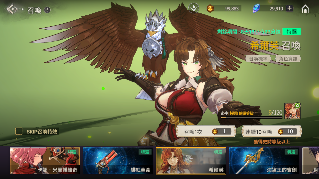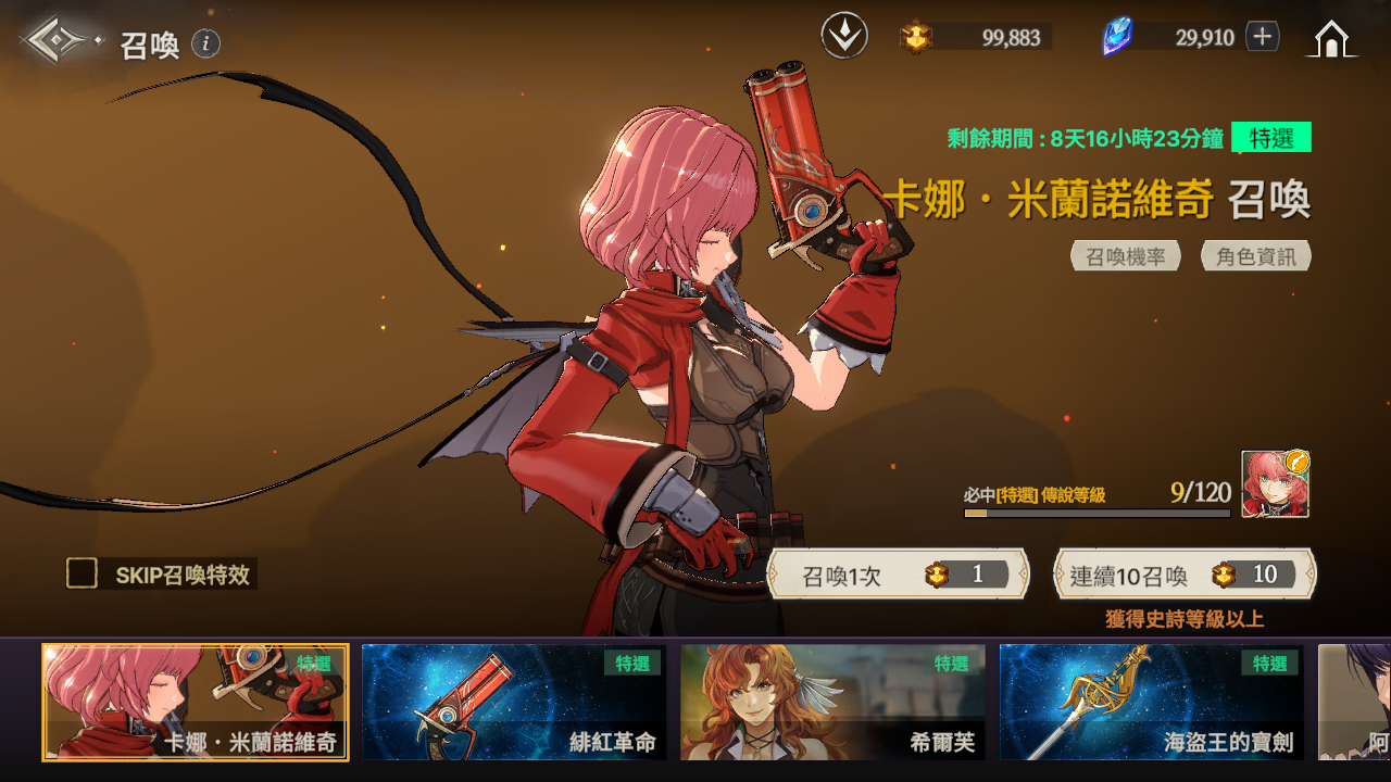 ※ 如果到累計召喚120次為止還沒有獲得特選角色,那麼在第120次時將必中特選角色。