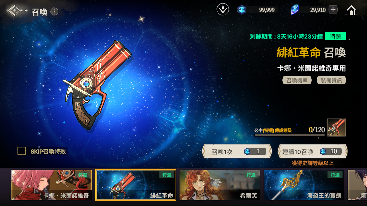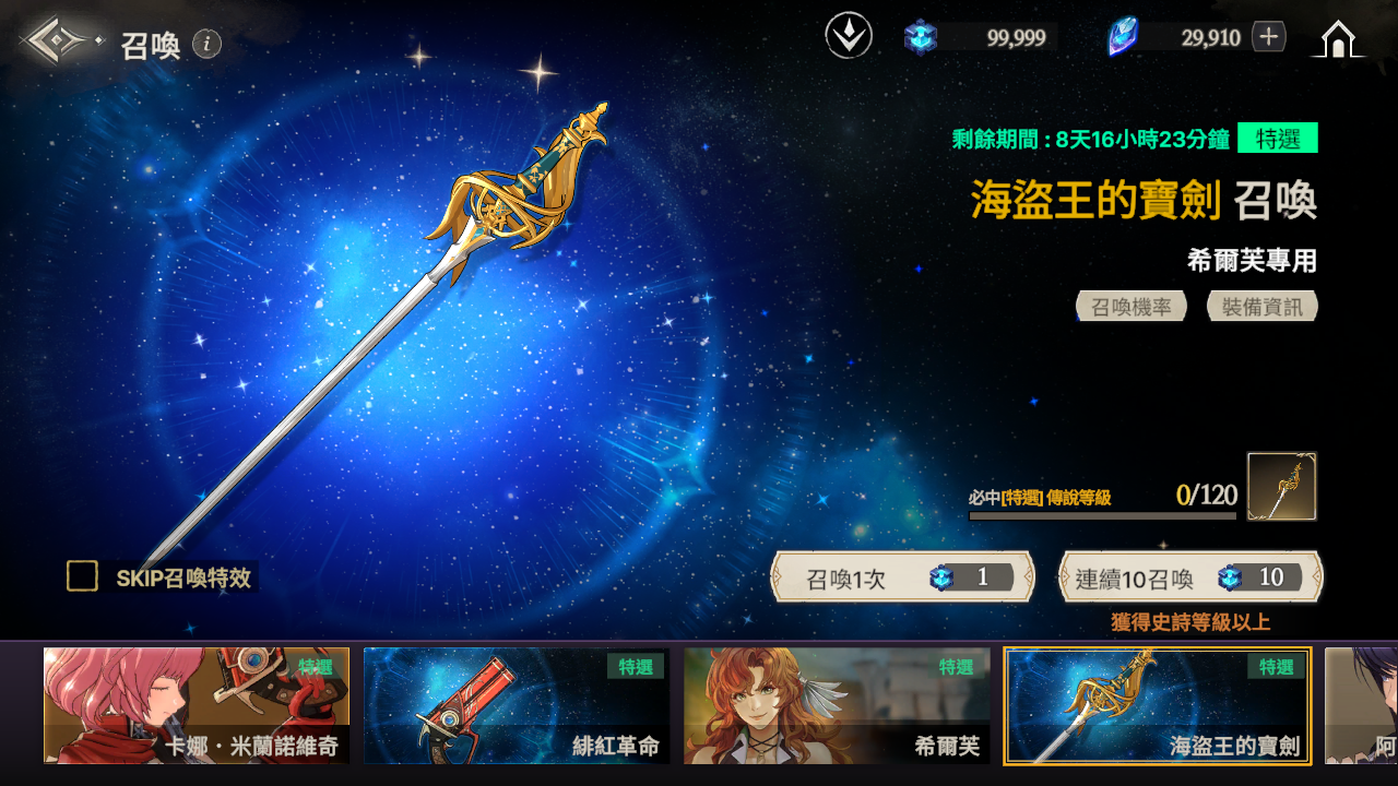 ※ 如果到累計召喚120次為止還沒有獲得特選武器,那麼在第120次時將必中特選武器。