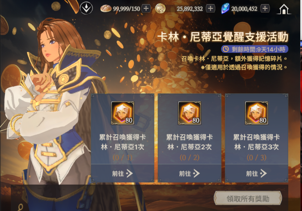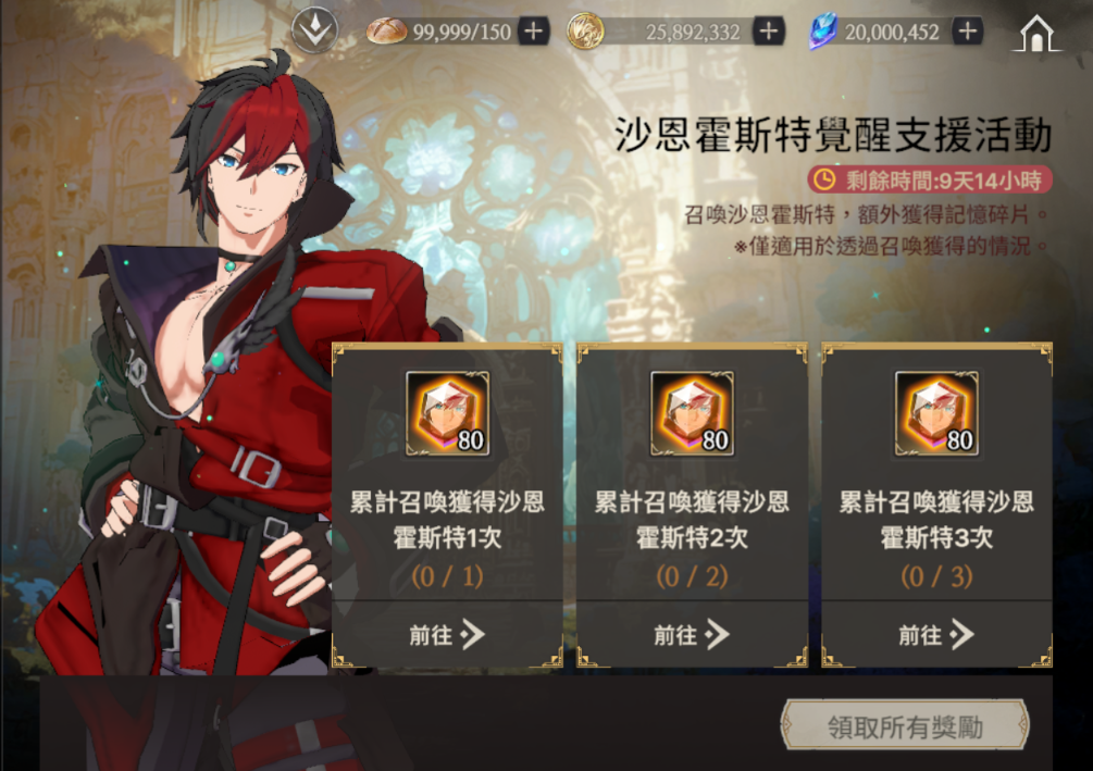 立即獲得: 混沌之血*1 任一角色覺醒1次: 萬物方塊*30 完成轉職1次 :透明蛋白石*1 任一角色達到等級10:寶石碎片箱*200 任一角色達到等級15:秘傳箱 I*200 任一角色達到等級20:寶石塊箱*200 任一角色達到等級30:秘傳箱 II*200 任一角色達到等級40:無瑕寶石箱*200 任一角色達到等級50:秘傳箱 III*200 |
