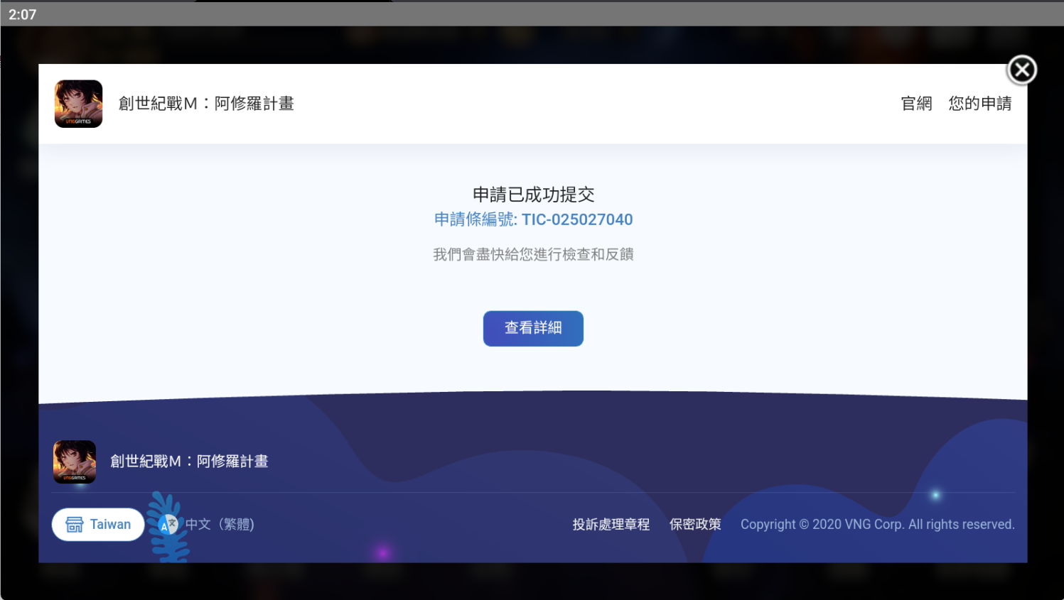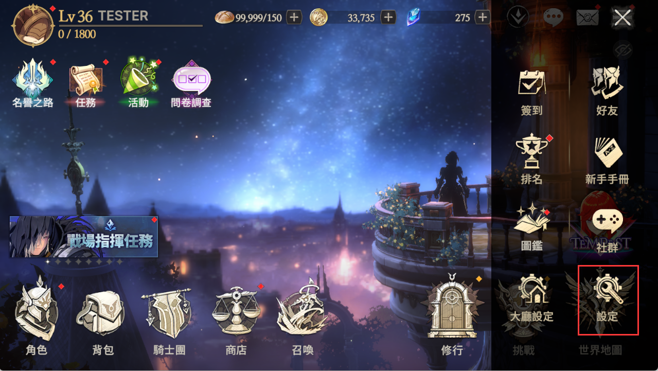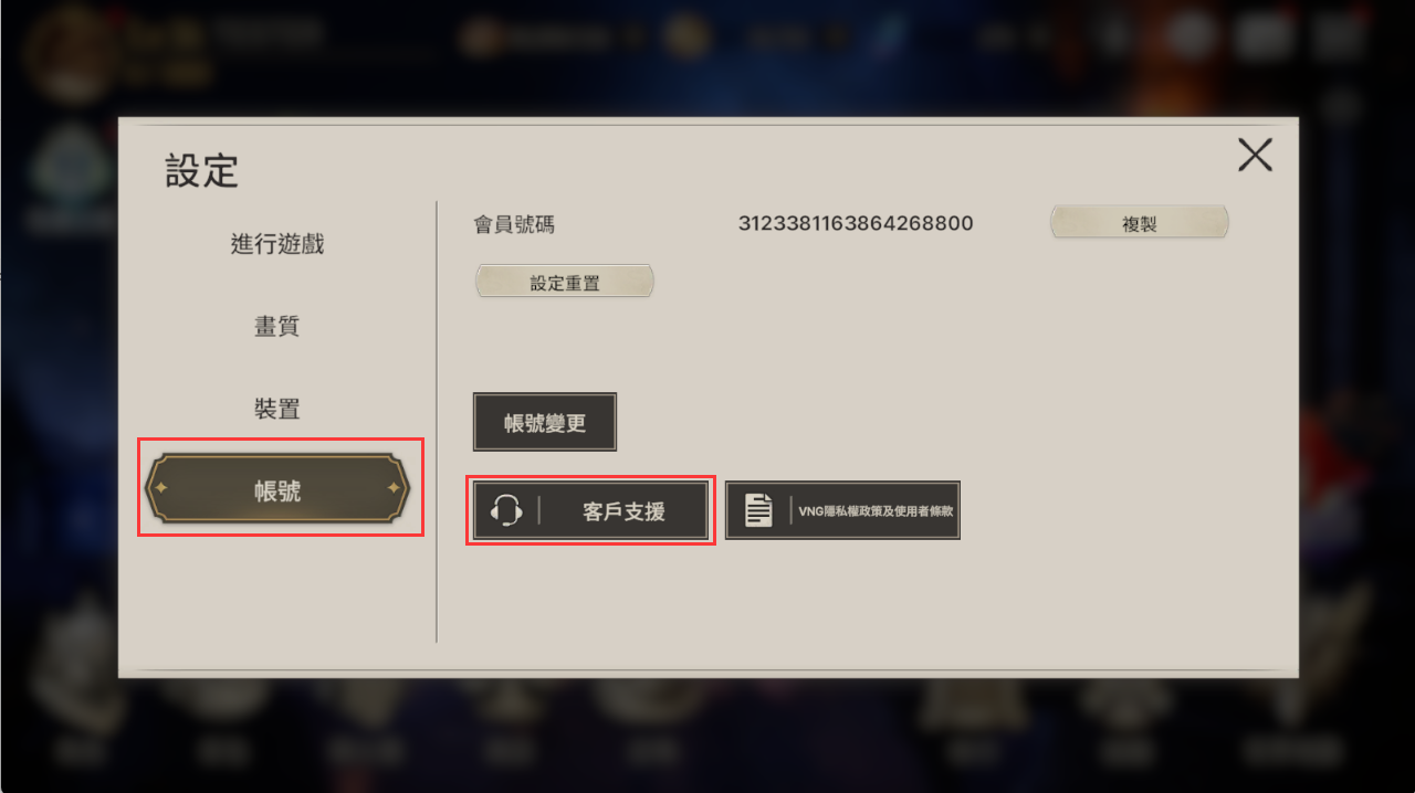 至遊戲畫面右上方「選單」→ 點擊「設定」→ 點擊「帳號」→ 點擊「客戶支援」