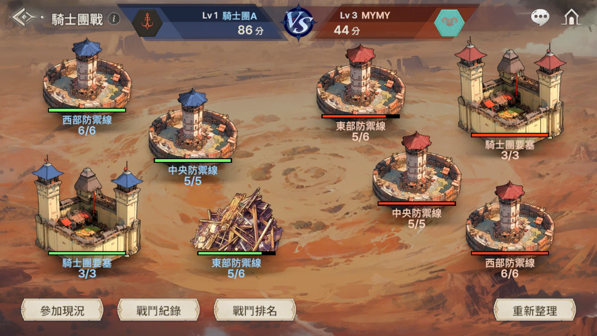 - 騎士團戰分為[參加申請→等待部署→部署→等待戰鬥→戰鬥→結束]階段。