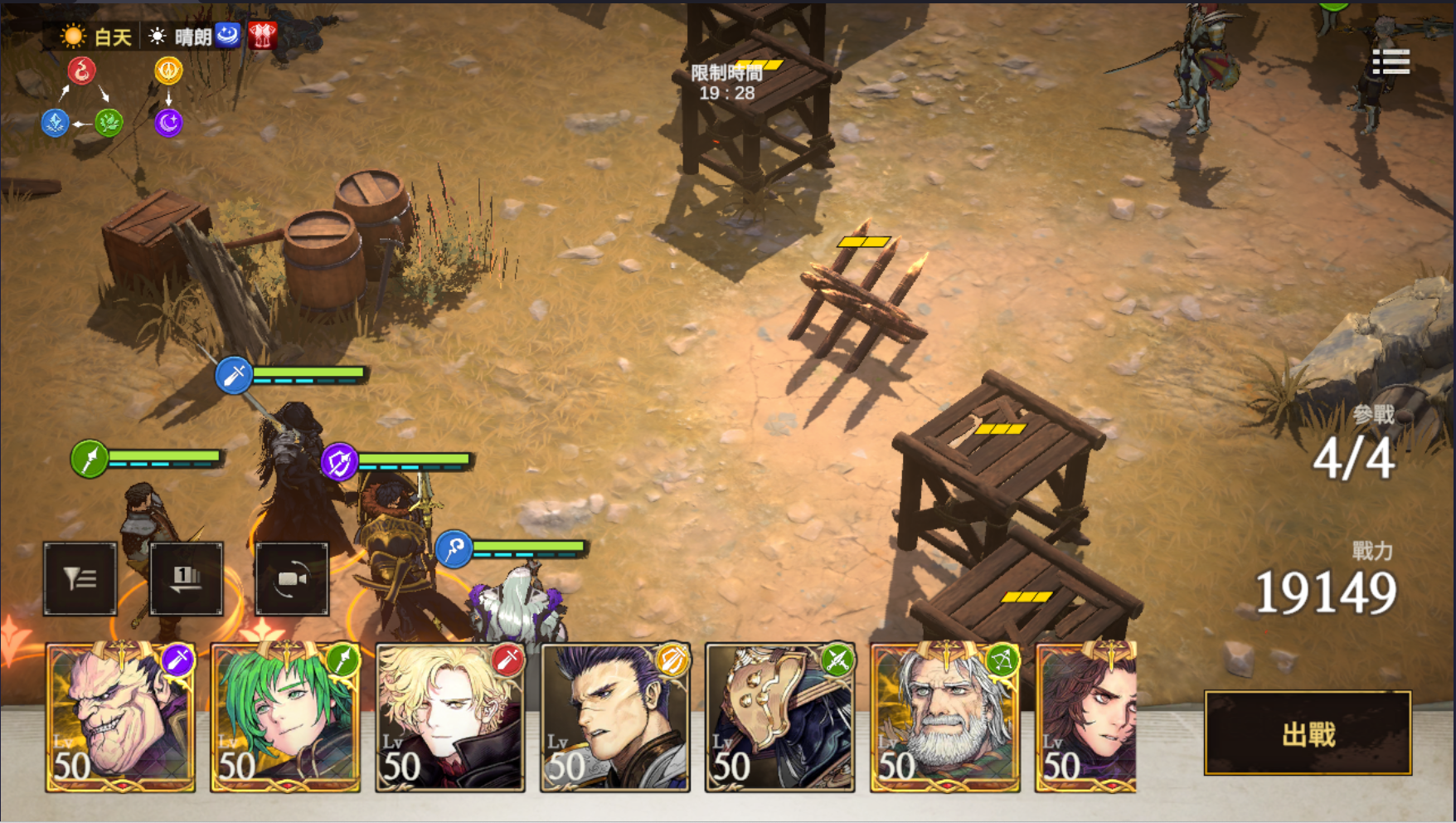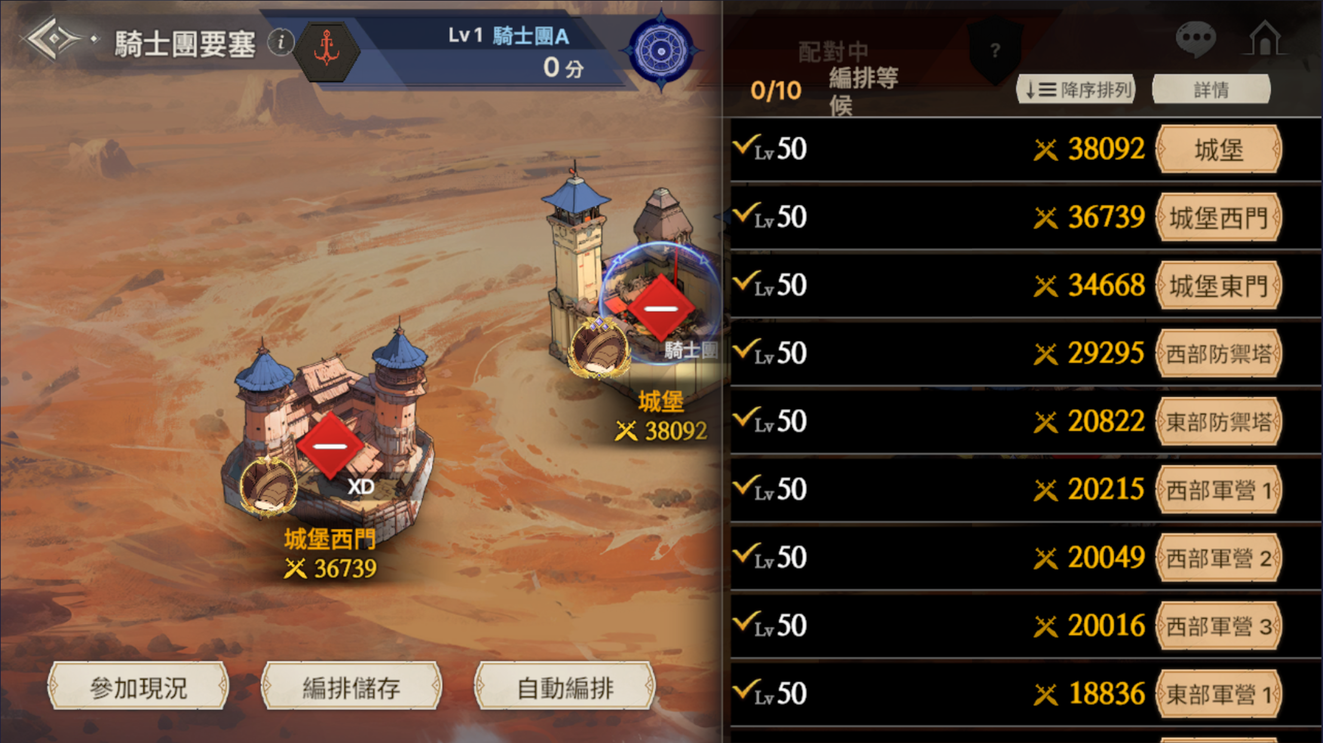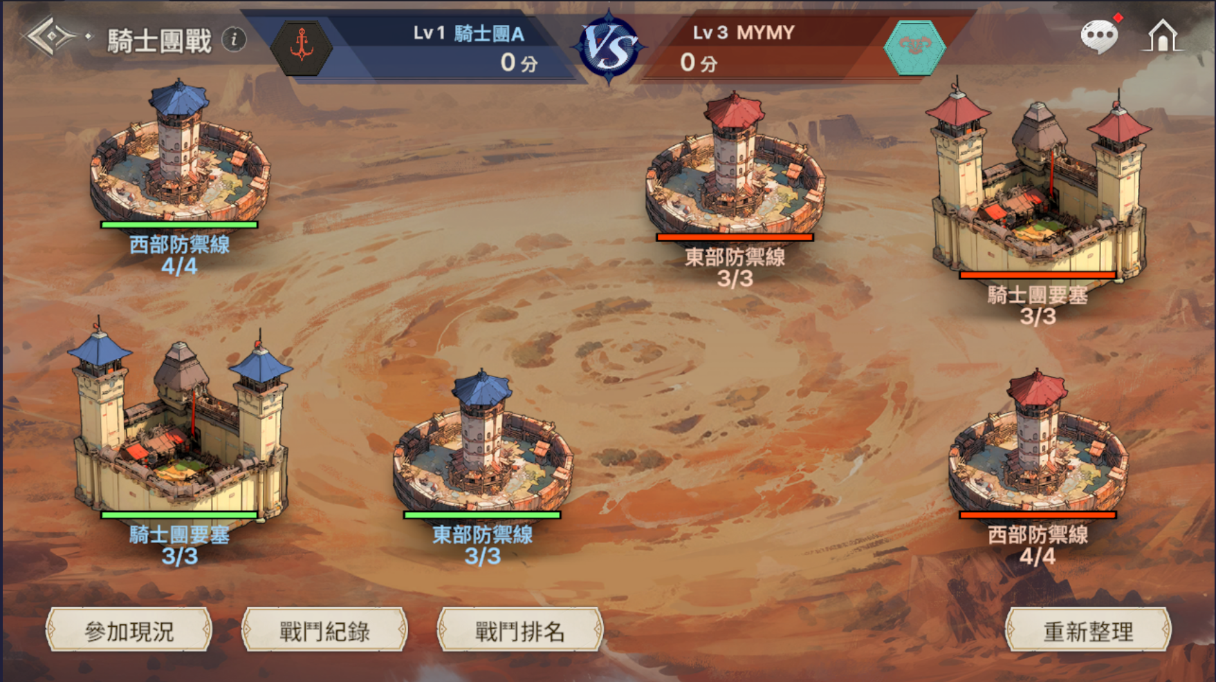 - 部署結束後,則進入15分鐘的等待戰鬥階段,15分鐘結束後騎士團戰正式開始。