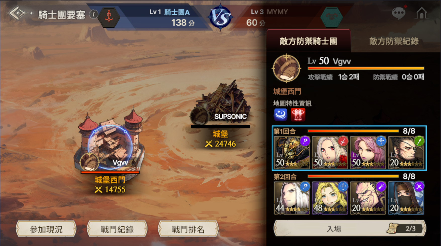 2.剩餘東門、西門生命值總和較多的騎士團獲勝。