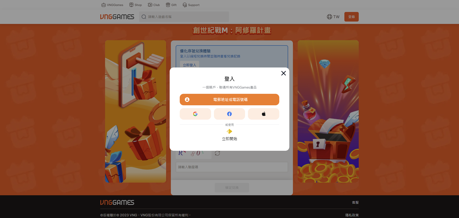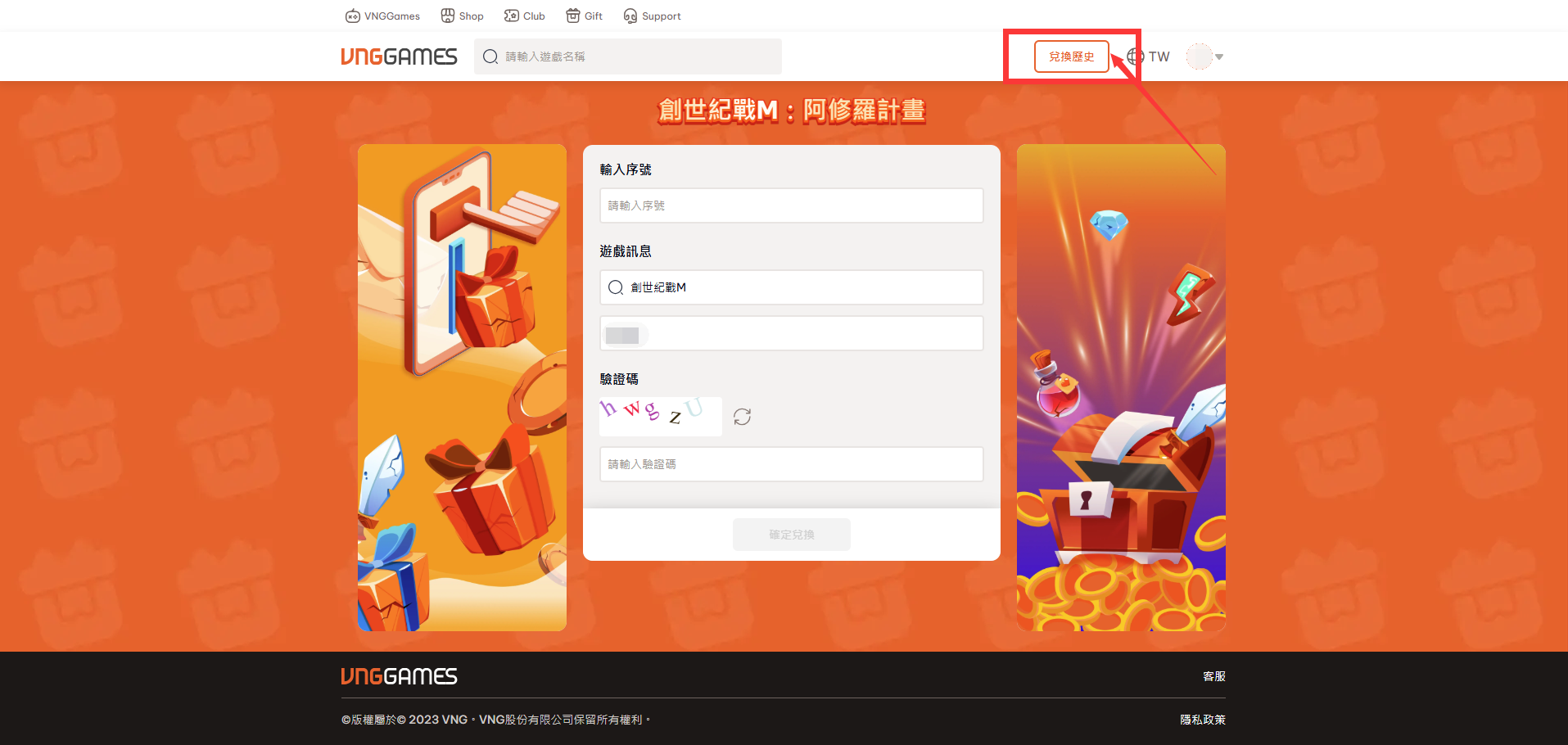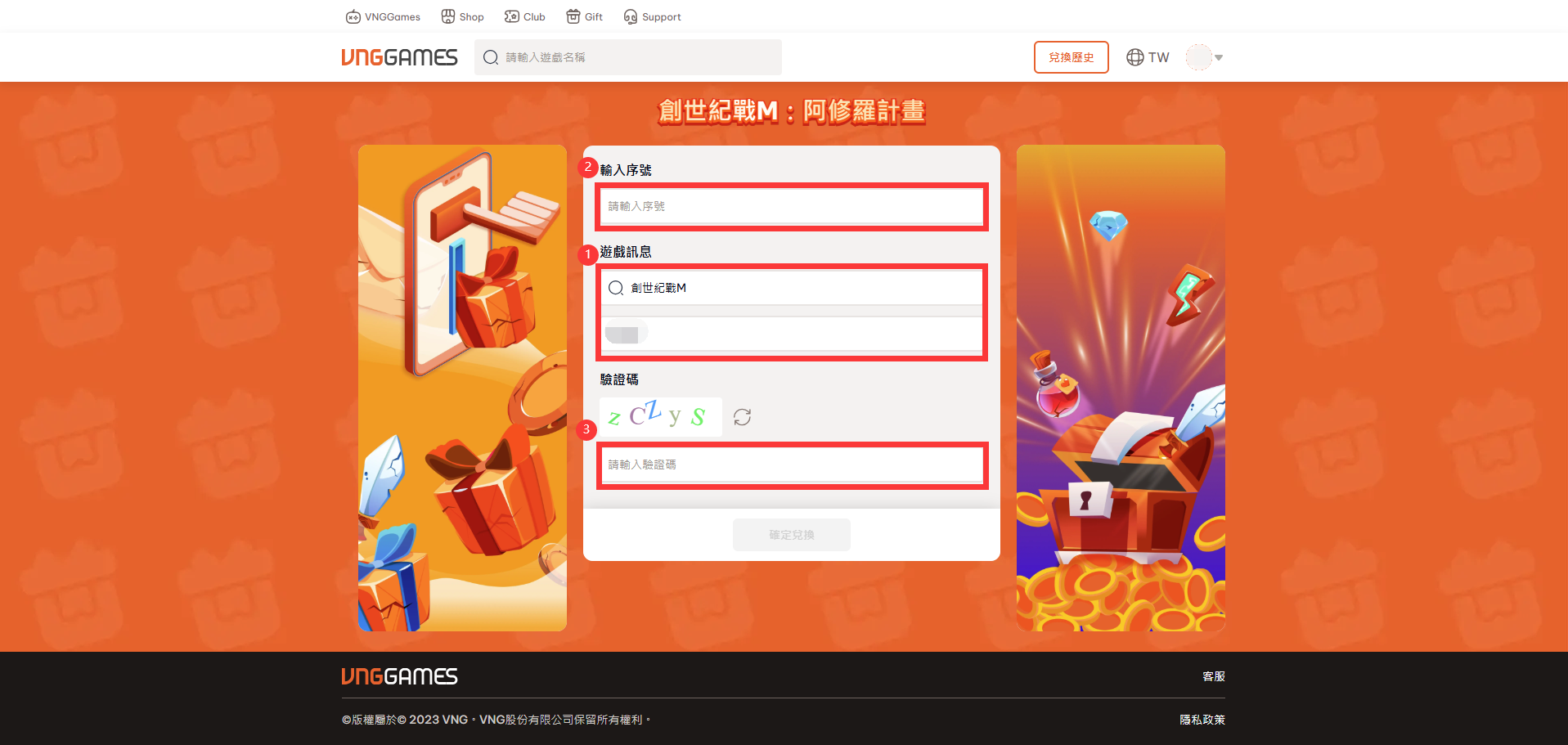 (3) 確認「角色資訊」後,輸入「序號碼」以及「驗證碼」後點擊確認兌換即可成功兌換。