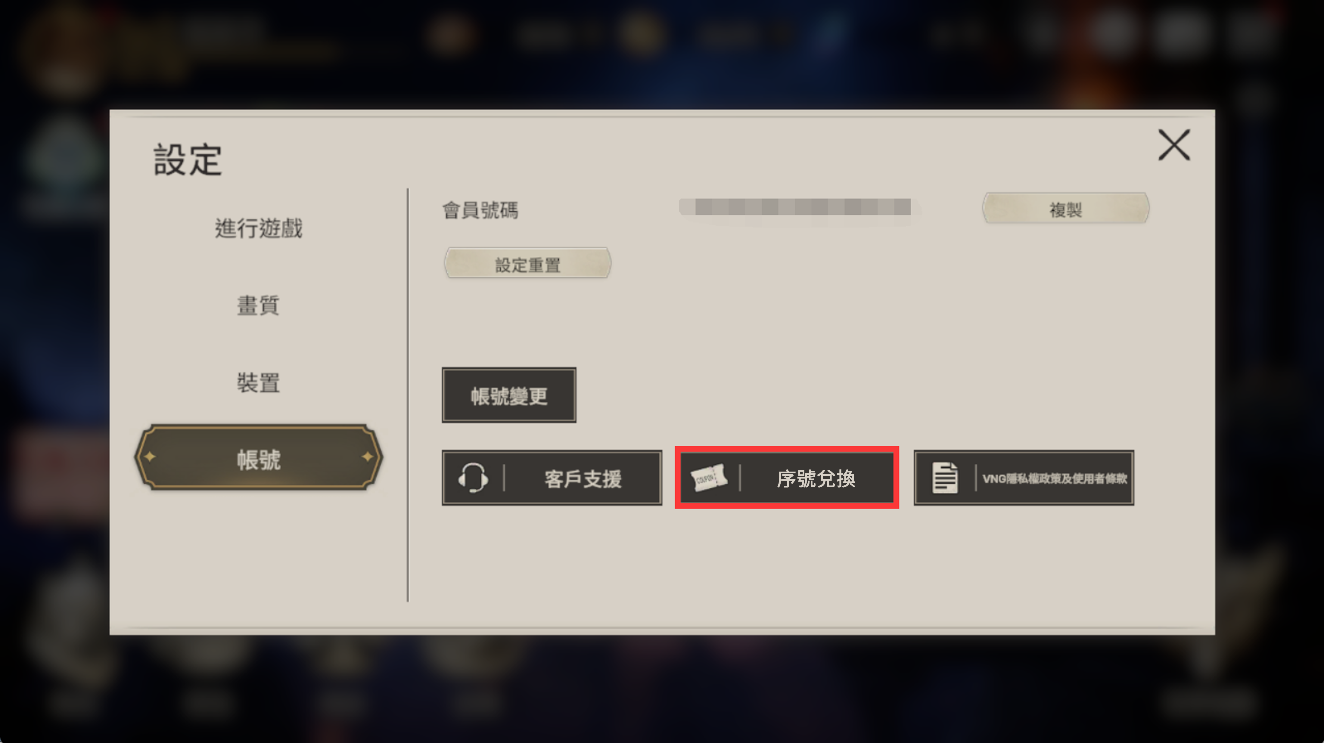 (1) 進入序號兌換頁面:點我前往※亦可於遊戲中,點擊「選單」→「設定」→「帳號」→「序號兌換」前往。